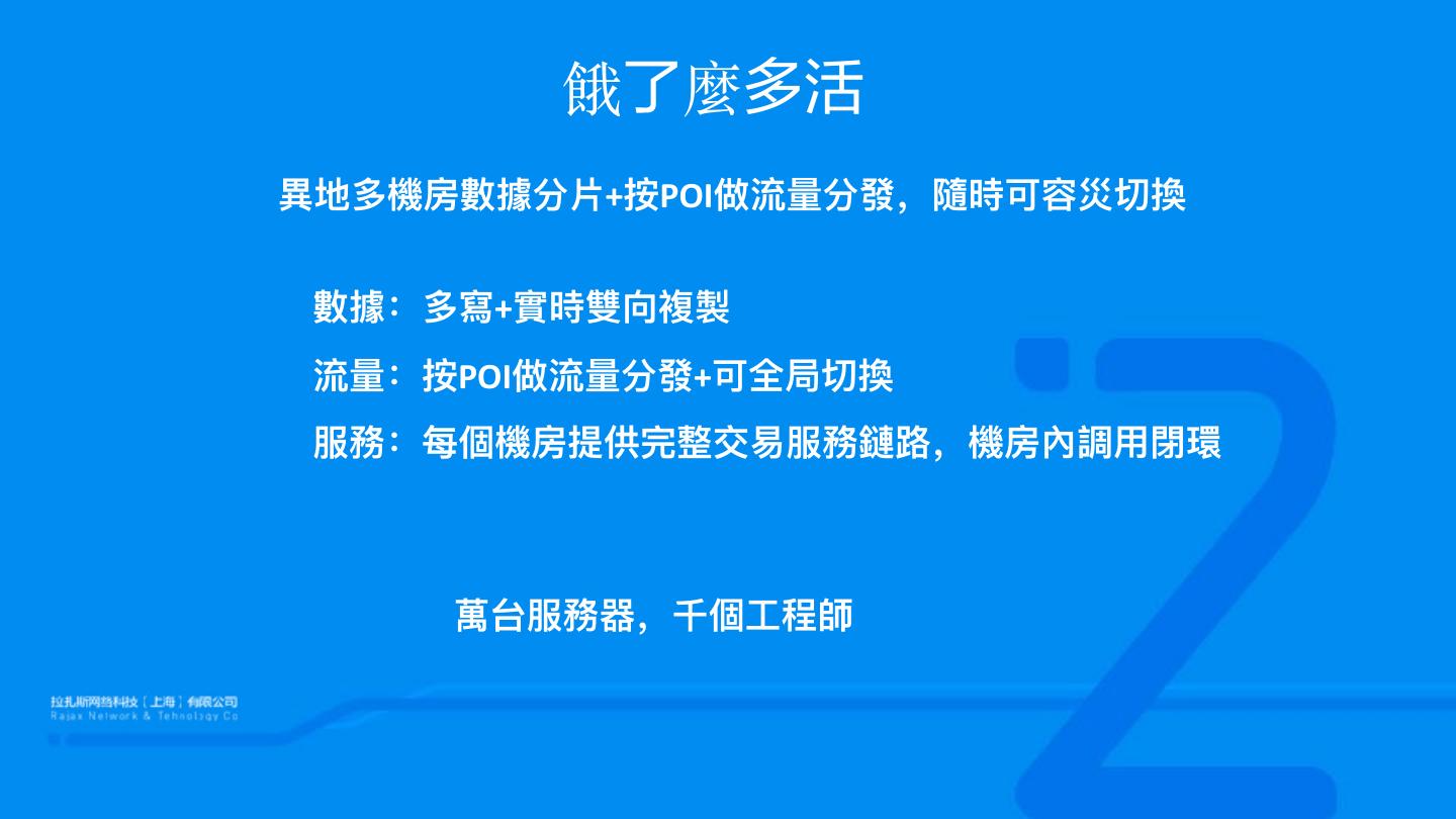 8 . 餓了麼多活 異異地多機房數數據分⽚片+按POI做流量量分發,隨時可容災切換 數數據:多寫+實時雙向複製 流量量:按POI做流量量分發+可全局切換 服務:每個機房提供完整交易易服務鏈路路,機房內調⽤用閉環 萬台服務器器,千個⼯工程師