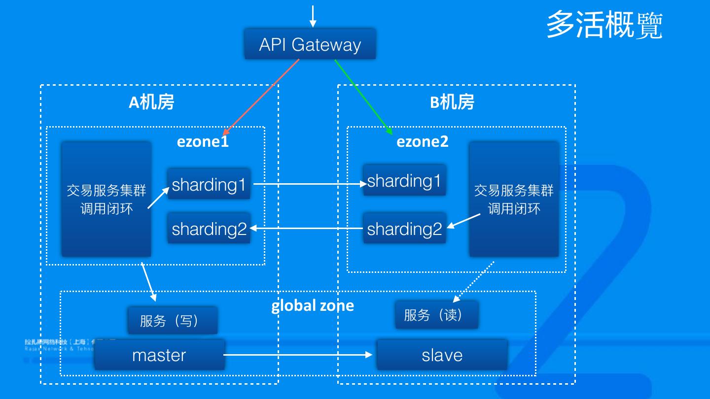 9 . 多活概覽 API Gateway A机房 B机房 ezone1 ezone2 交易易服务集群 sharding1 sharding1 交易易服务集群 调⽤用闭环 调⽤用闭环 sharding2 sharding2 global zone 服务(写) 服务(读) master slave