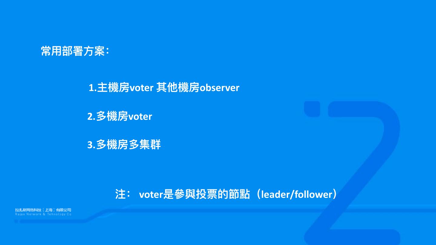 13 .常⽤用部署⽅方案: 1.主機房voter 其他機房observer 2.多機房voter 3.多機房多集群 注: voter是參參與投票的節點(leader/follower)