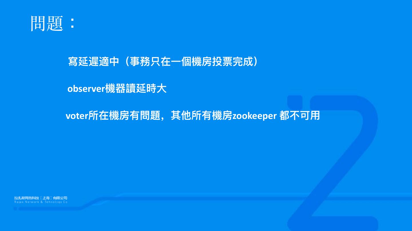 15 .問題 : 寫延遲適中(事務只在⼀一個機房投票完成) observer機器器讀延時⼤大 voter所在機房有問題,其他所有機房zookeeper 都不不可⽤用