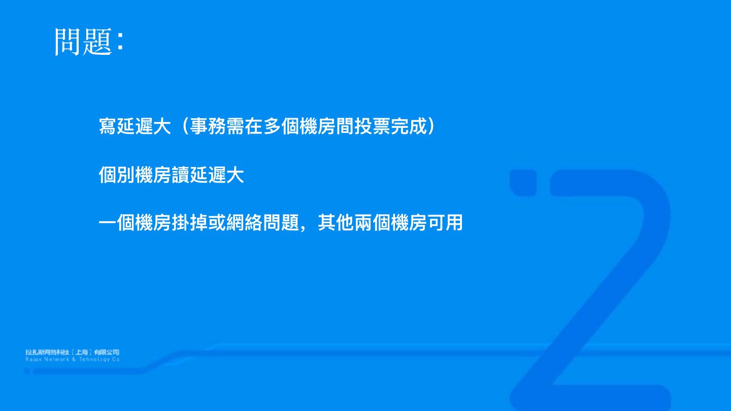 17 .問題: 寫延遲⼤大(事務需在多個機房間投票完成) 個別機房讀延遲⼤大 ⼀一個機房掛掉或網絡問題,其他兩個機房可⽤用