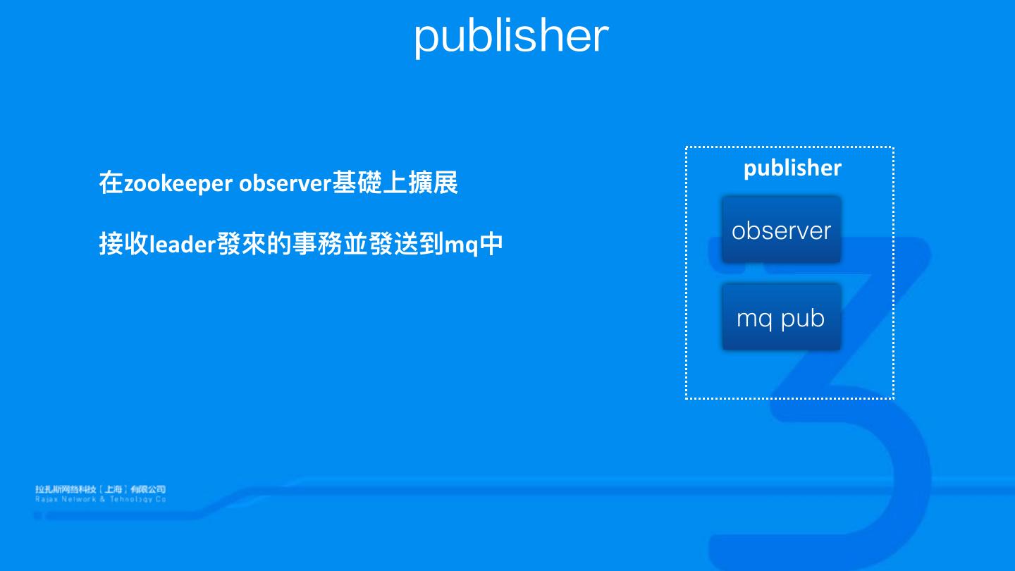 21 . publisher publisher 在zookeeper observer基礎上擴展 observer 接收leader發來來的事務並發送到mq中 mq pub