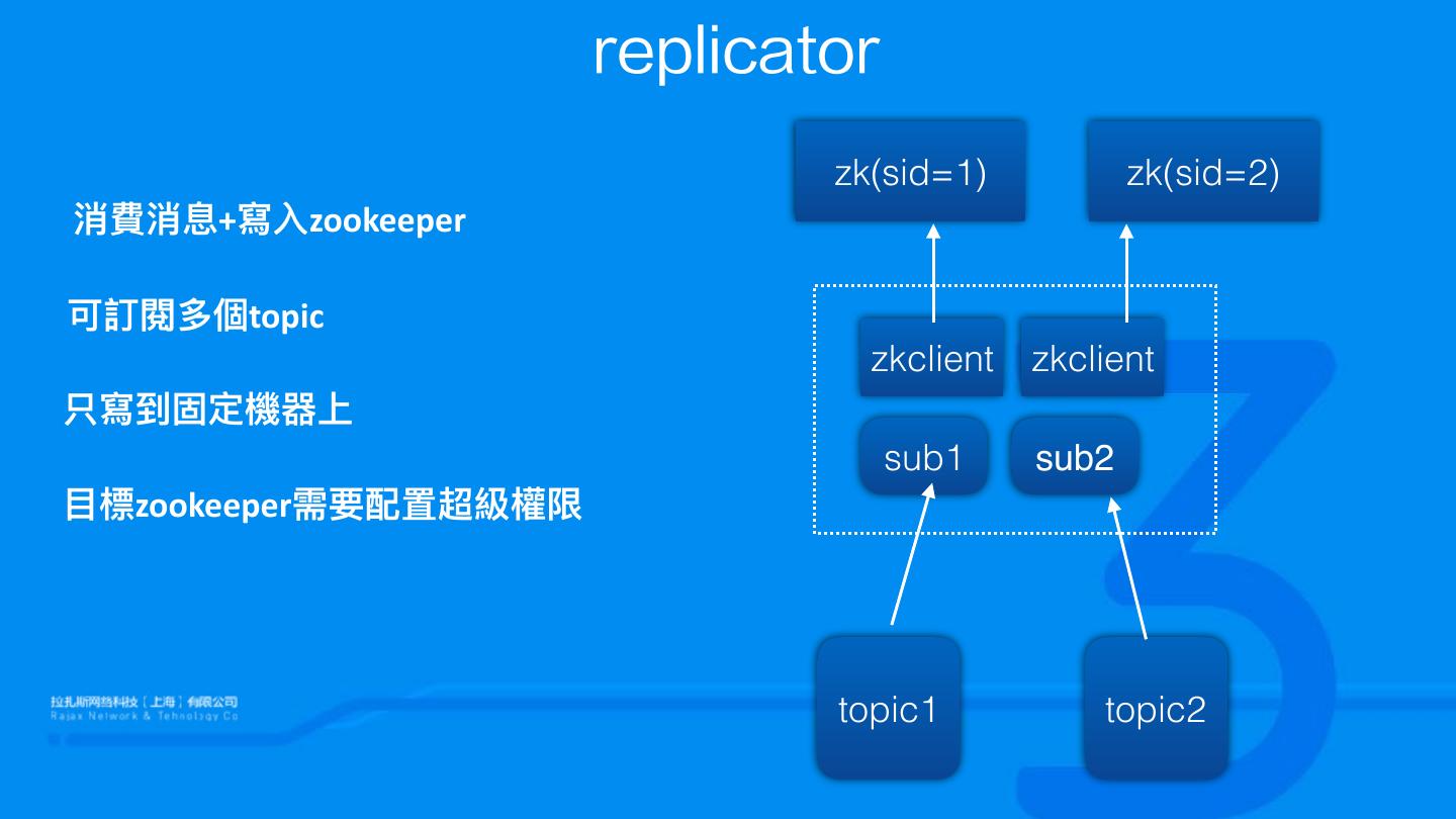 22 . replicator zk(sid=1) zk(sid=2) 消費消息+寫⼊入zookeeper 可訂閱多個topic zkclient zkclient 只寫到固定機器器上 sub1 sub2 ⽬目標zookeeper需要配置超級權限 topic1 topic2