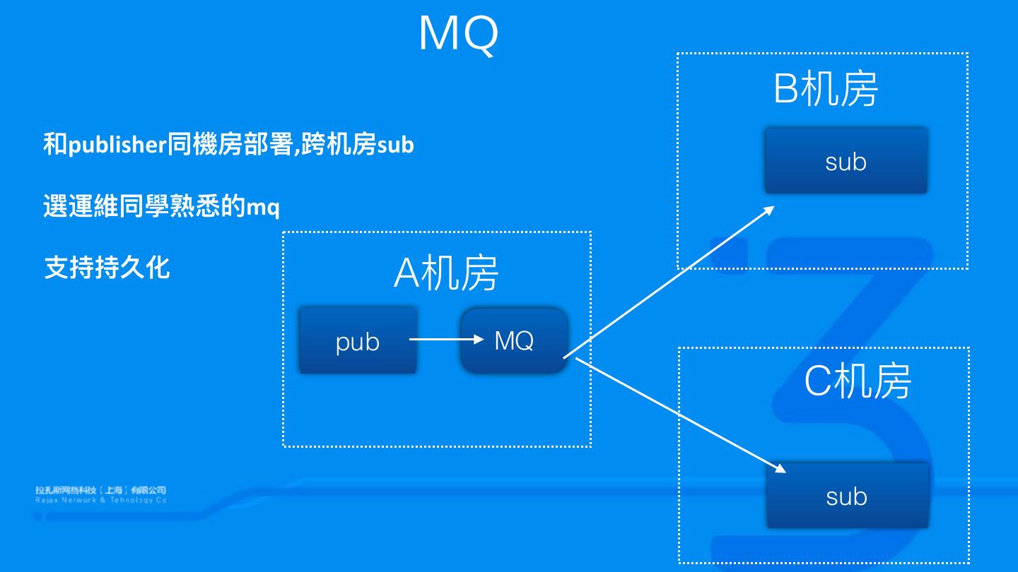 23 . MQ B机房 和publisher同機房部署,跨机房sub sub 選運維同學熟悉的mq ⽀支持持久化 A机房 pub MQ C机房 sub