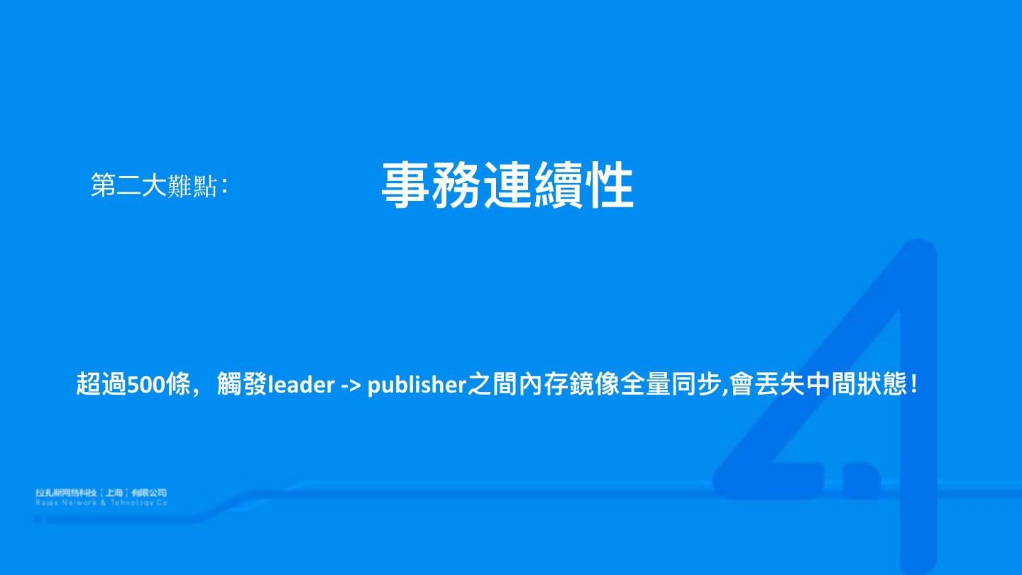 27 .第二大難點: 事務連續性 超過500條,觸發leader -> publisher之間內存鏡像全量量同步,會丟失中間狀狀態!