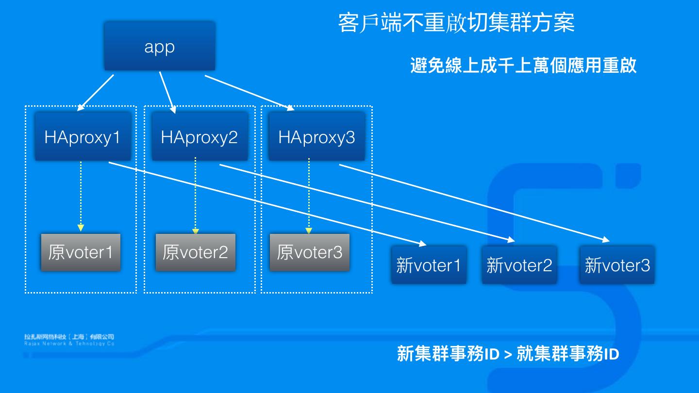 16 . 多voter部署方案 A机房 B机房 C机房 voter1 voter4 voter6 voter2 voter5 voter7 voter3 N1=(N-1)/2 N2= 1~(N-N1)/2 N3=N-N1-N2 3 2 2 ⼀一個機房有問題,其他兩個機房超過⼀一半機器器連接,服務可⽤用