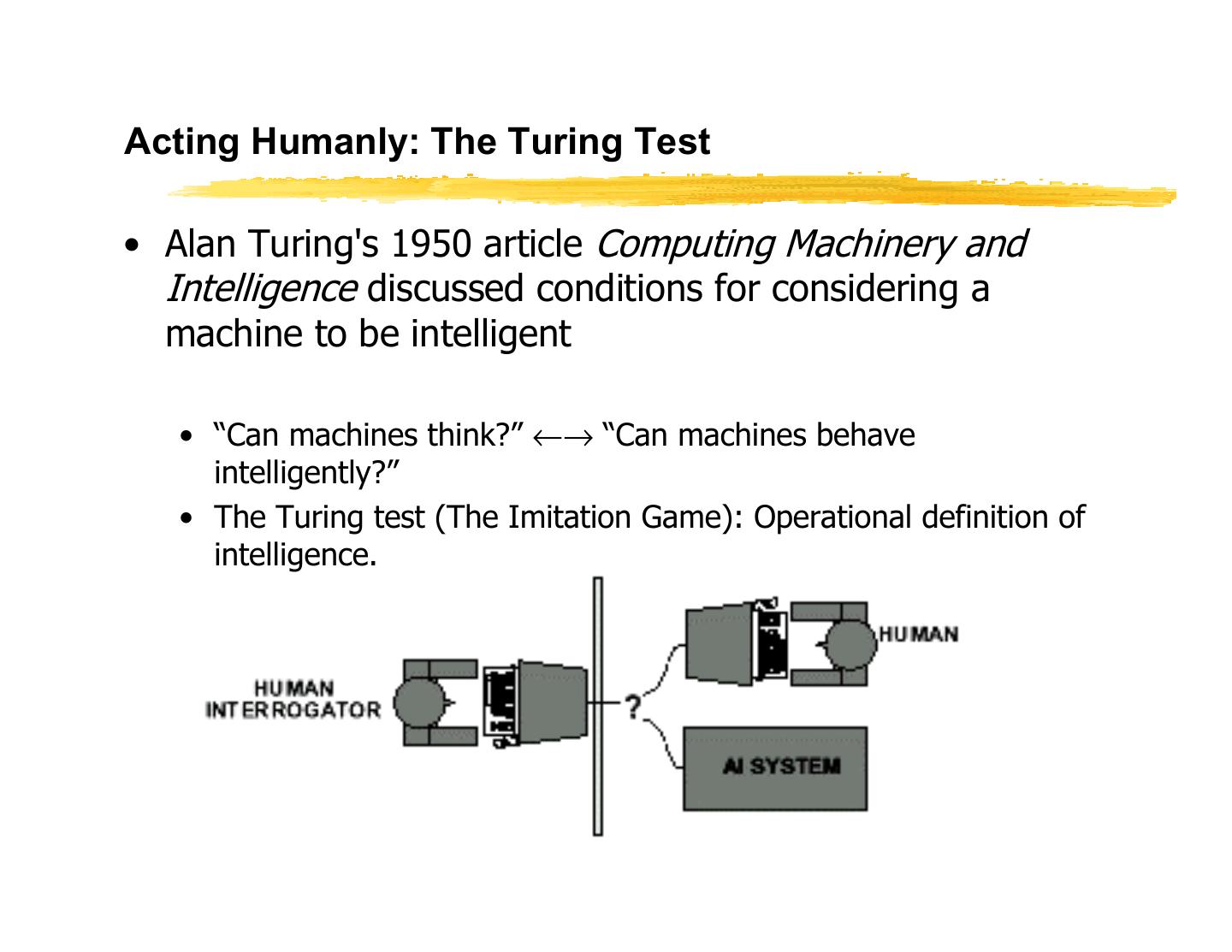 10 .Acting Humanly: The Turing Test • Alan Turing's 1950 article Computing Machinery and Intelligence discussed conditions for considering a machine to be intelligent • “Can machines think?” ←→ “Can machines behave intelligently?” • The Turing test (The Imitation Game): Operational definition of intelligence. CS 460, Lecture 1