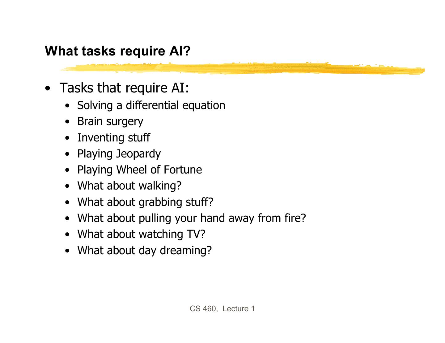 13 .What tasks require AI? • Tasks that require AI: • Solving a differential equation • Brain surgery • Inventing stuff • Playing Jeopardy • Playing Wheel of Fortune • What about walking? • What about grabbing stuff? • What about pulling your hand away from fire? • What about watching TV? • What about day dreaming? CS 460, Lecture 1