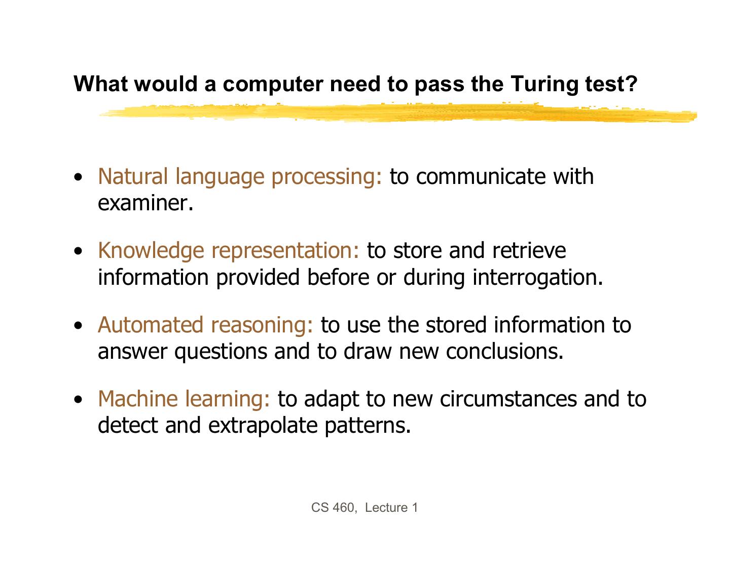 17 .What would a computer need to pass the Turing test? • Natural language processing: to communicate with examiner. • Knowledge representation: to store and retrieve information provided before or during interrogation. • Automated reasoning: to use the stored information to answer questions and to draw new conclusions. • Machine learning: to adapt to new circumstances and to detect and extrapolate patterns. CS 460, Lecture 1