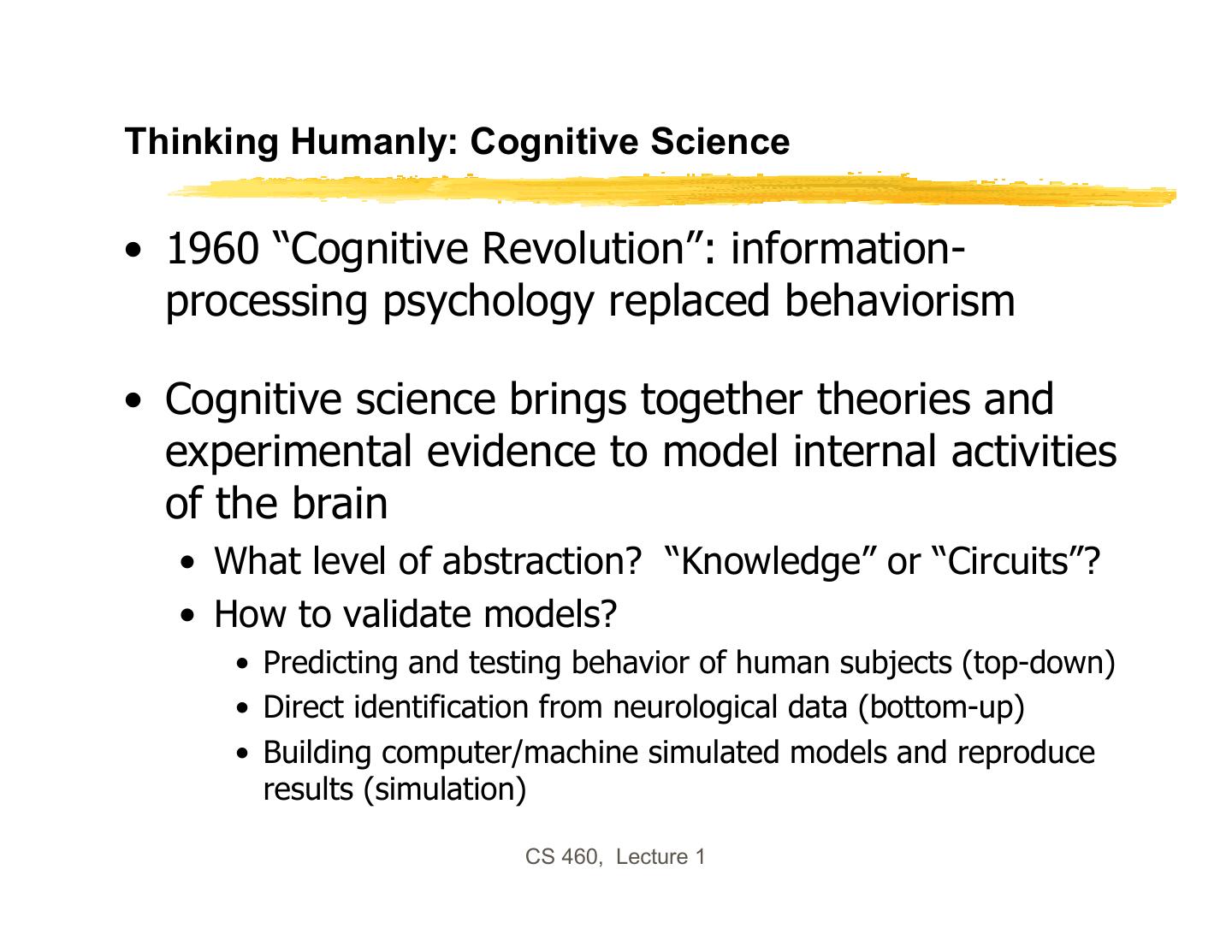 19 .Thinking Humanly: Cognitive Science • 1960 “Cognitive Revolution”: information- processing psychology replaced behaviorism • Cognitive science brings together theories and experimental evidence to model internal activities of the brain • What level of abstraction? “Knowledge” or “Circuits”? • How to validate models? • Predicting and testing behavior of human subjects (top-down) • Direct identification from neurological data (bottom-up) • Building computer/machine simulated models and reproduce results (simulation) CS 460, Lecture 1