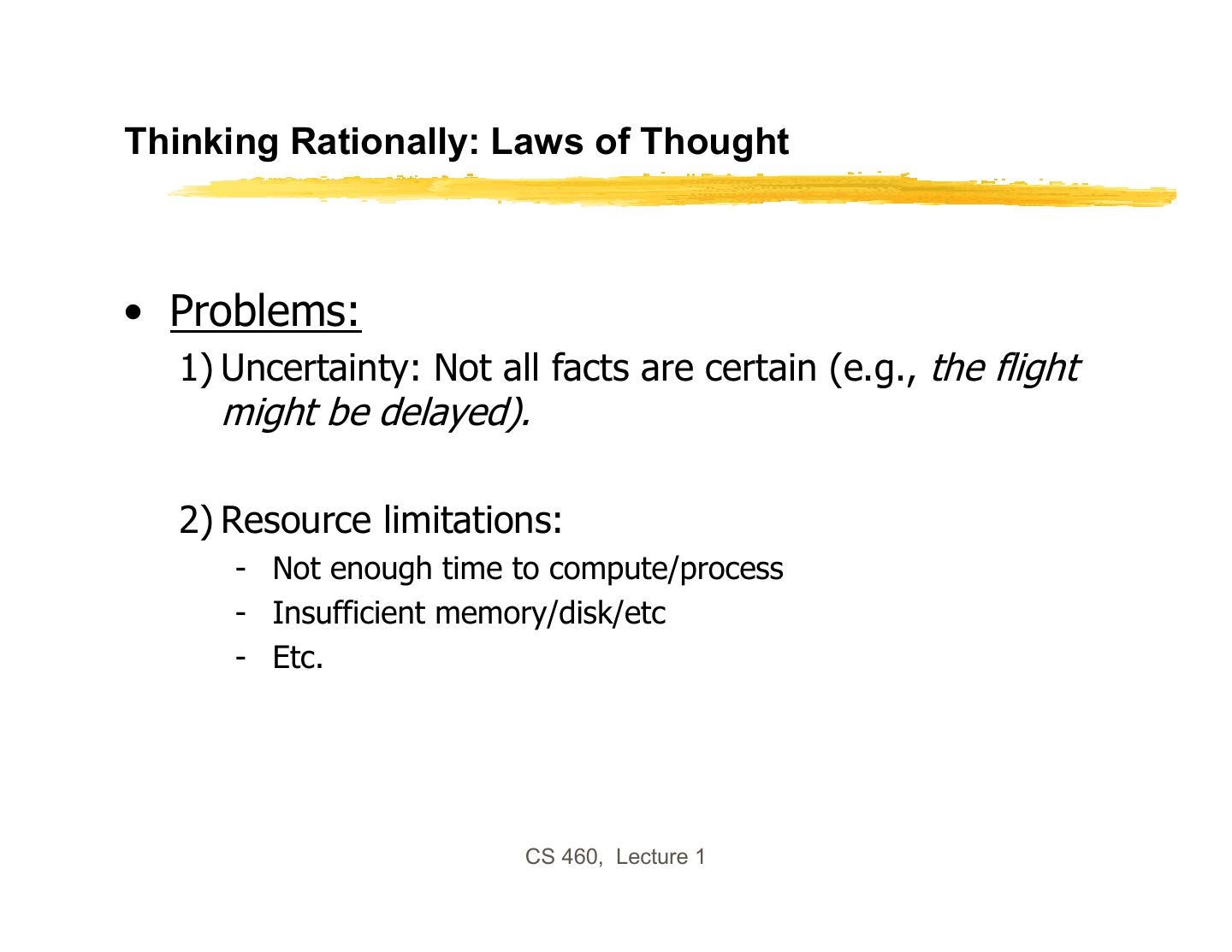 21 .Thinking Rationally: Laws of Thought • Problems: 1) Uncertainty: Not all facts are certain (e.g., the flight might be delayed). 2) Resource limitations: - Not enough time to compute/process - Insufficient memory/disk/etc - Etc. CS 460, Lecture 1