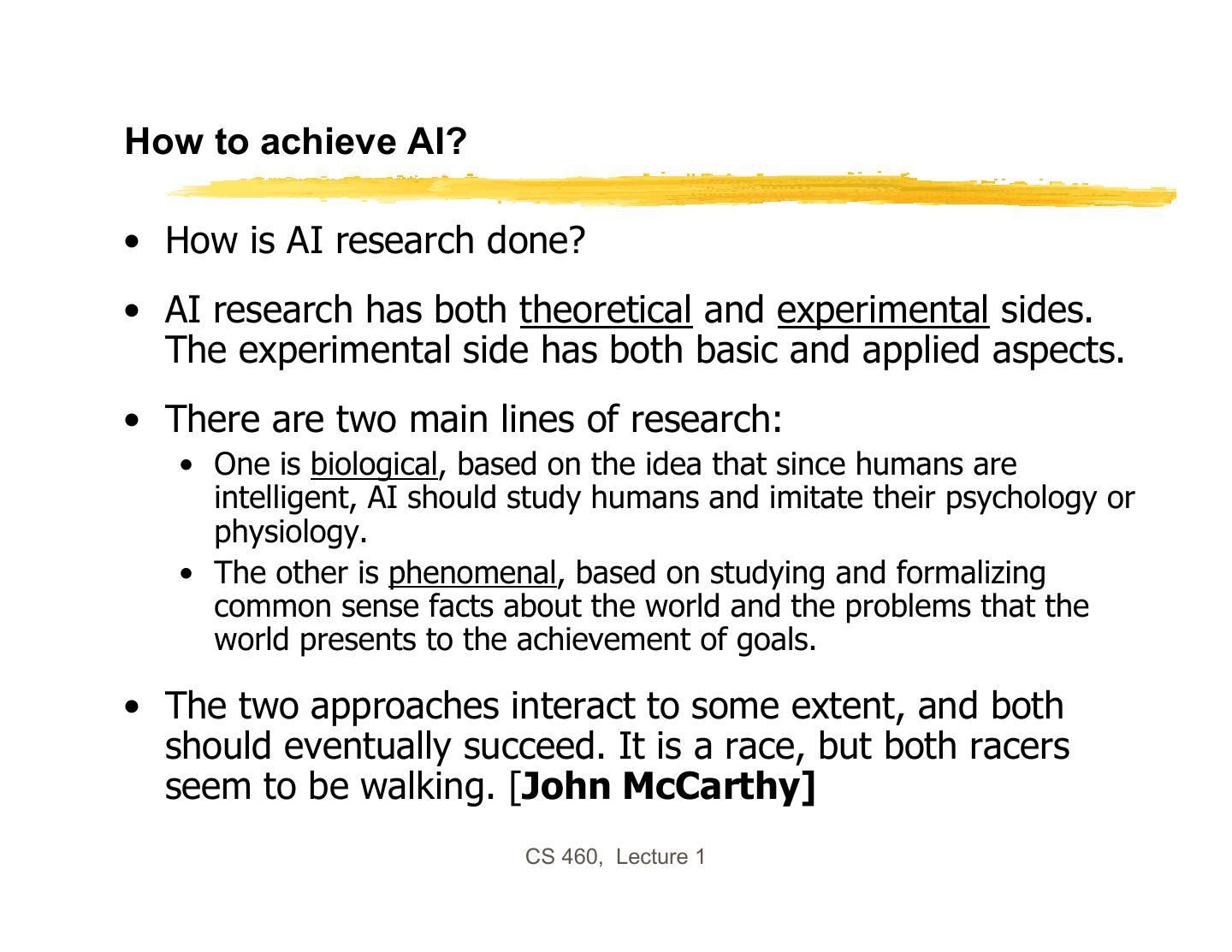 23 .How to achieve AI? • How is AI research done? • AI research has both theoretical and experimental sides. The experimental side has both basic and applied aspects. • There are two main lines of research: • One is biological, based on the idea that since humans are intelligent, AI should study humans and imitate their psychology or physiology. • The other is phenomenal, based on studying and formalizing common sense facts about the world and the problems that the world presents to the achievement of goals. • The two approaches interact to some extent, and both should eventually succeed. It is a race, but both racers seem to be walking. [John McCarthy] CS 460, Lecture 1