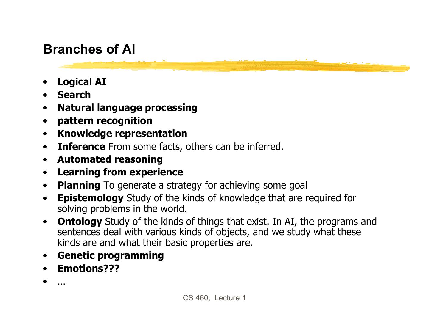 24 .Branches of AI • Logical AI • Search • Natural language processing • pattern recognition • Knowledge representation • Inference From some facts, others can be inferred. • Automated reasoning • Learning from experience • Planning To generate a strategy for achieving some goal • Epistemology Study of the kinds of knowledge that are required for solving problems in the world. • Ontology Study of the kinds of things that exist. In AI, the programs and sentences deal with various kinds of objects, and we study what these kinds are and what their basic properties are. • Genetic programming • Emotions??? • … CS 460, Lecture 1