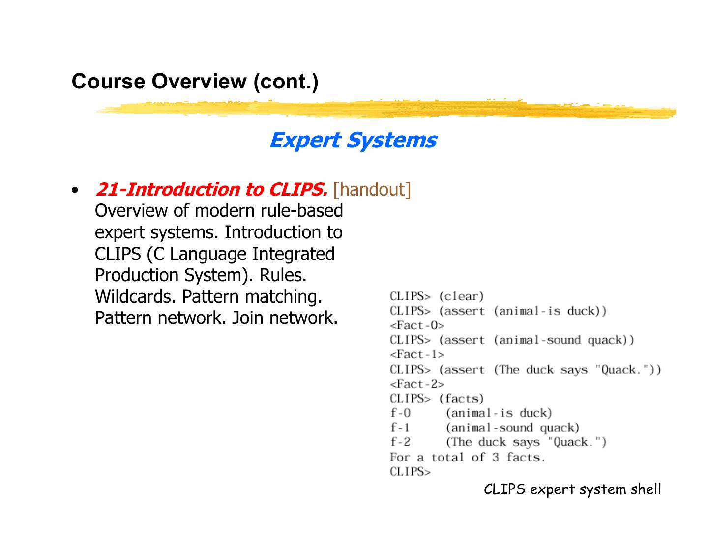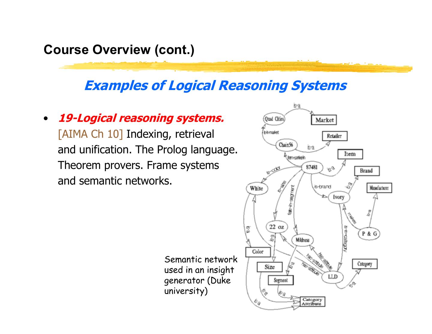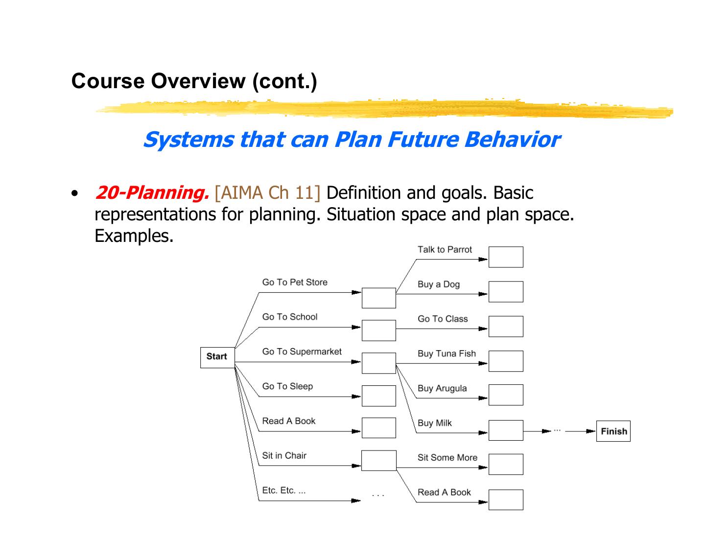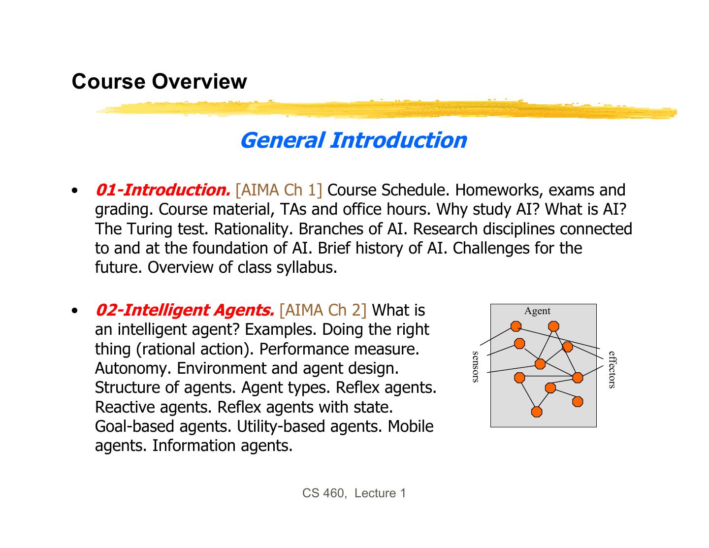 28 .Course Overview General Introduction • 01-Introduction. [AIMA Ch 1] Course Schedule. Homeworks, exams and grading. Course material, TAs and office hours. Why study AI? What is AI? The Turing test. Rationality. Branches of AI. Research disciplines connected to and at the foundation of AI. Brief history of AI. Challenges for the future. Overview of class syllabus. • 02-Intelligent Agents. [AIMA Ch 2] What is Agent an intelligent agent? Examples. Doing the right thing (rational action). Performance measure. sensors effectors Autonomy. Environment and agent design. Structure of agents. Agent types. Reflex agents. Reactive agents. Reflex agents with state. Goal-based agents. Utility-based agents. Mobile agents. Information agents. CS 460, Lecture 1