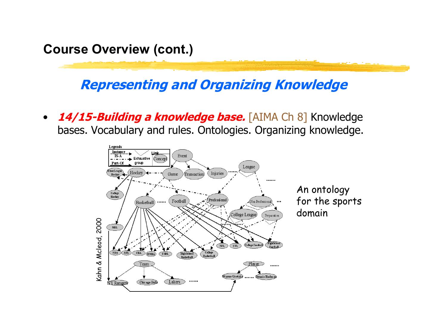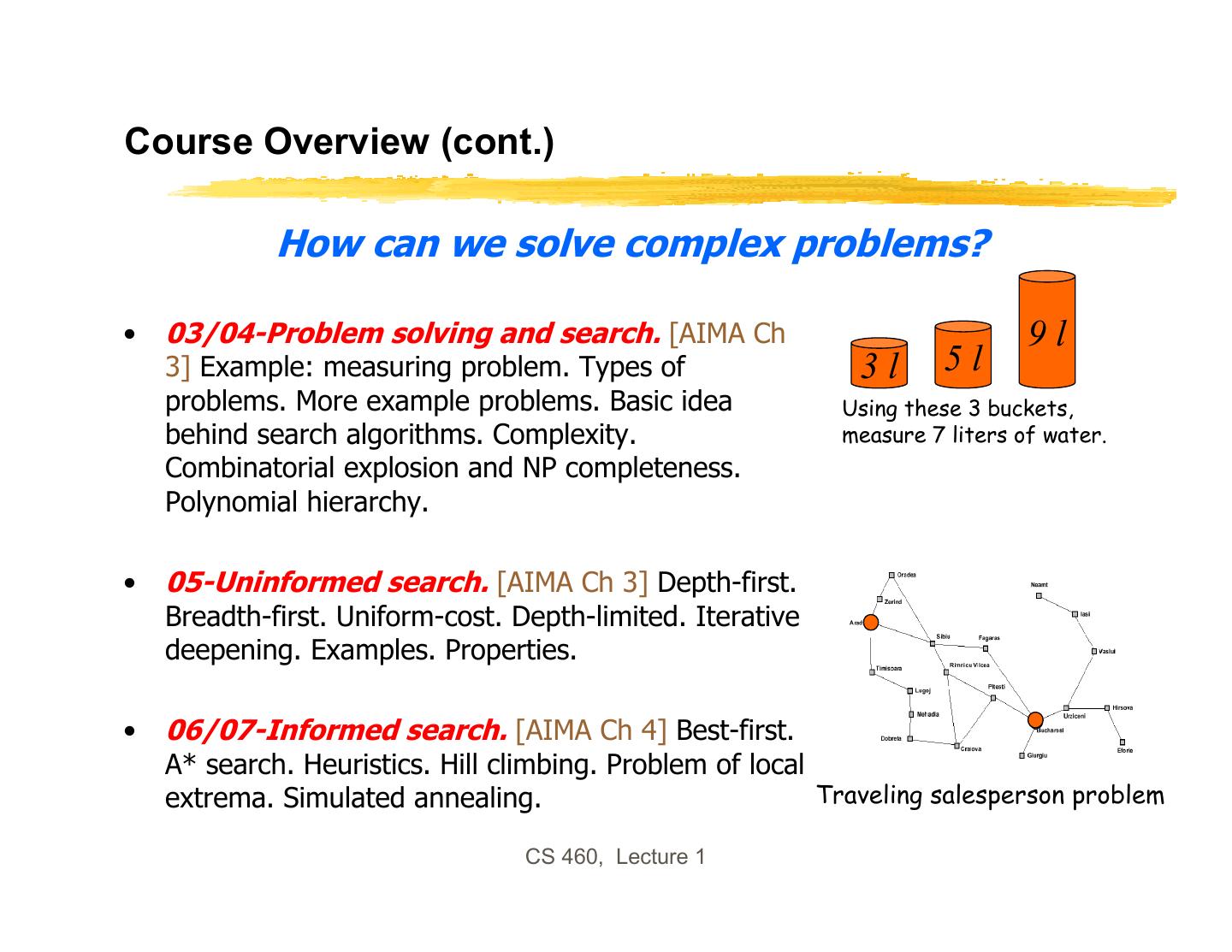 29 .Course Overview (cont.) How can we solve complex problems? • 03/04-Problem solving and search. [AIMA Ch 9l 3] Example: measuring problem. Types of 3l 5l problems. More example problems. Basic idea Using these 3 buckets, behind search algorithms. Complexity. measure 7 liters of water. Combinatorial explosion and NP completeness. Polynomial hierarchy. • 05-Uninformed search. [AIMA Ch 3] Depth-first. Breadth-first. Uniform-cost. Depth-limited. Iterative deepening. Examples. Properties. • 06/07-Informed search. [AIMA Ch 4] Best-first. A* search. Heuristics. Hill climbing. Problem of local extrema. Simulated annealing. Traveling salesperson problem CS 460, Lecture 1