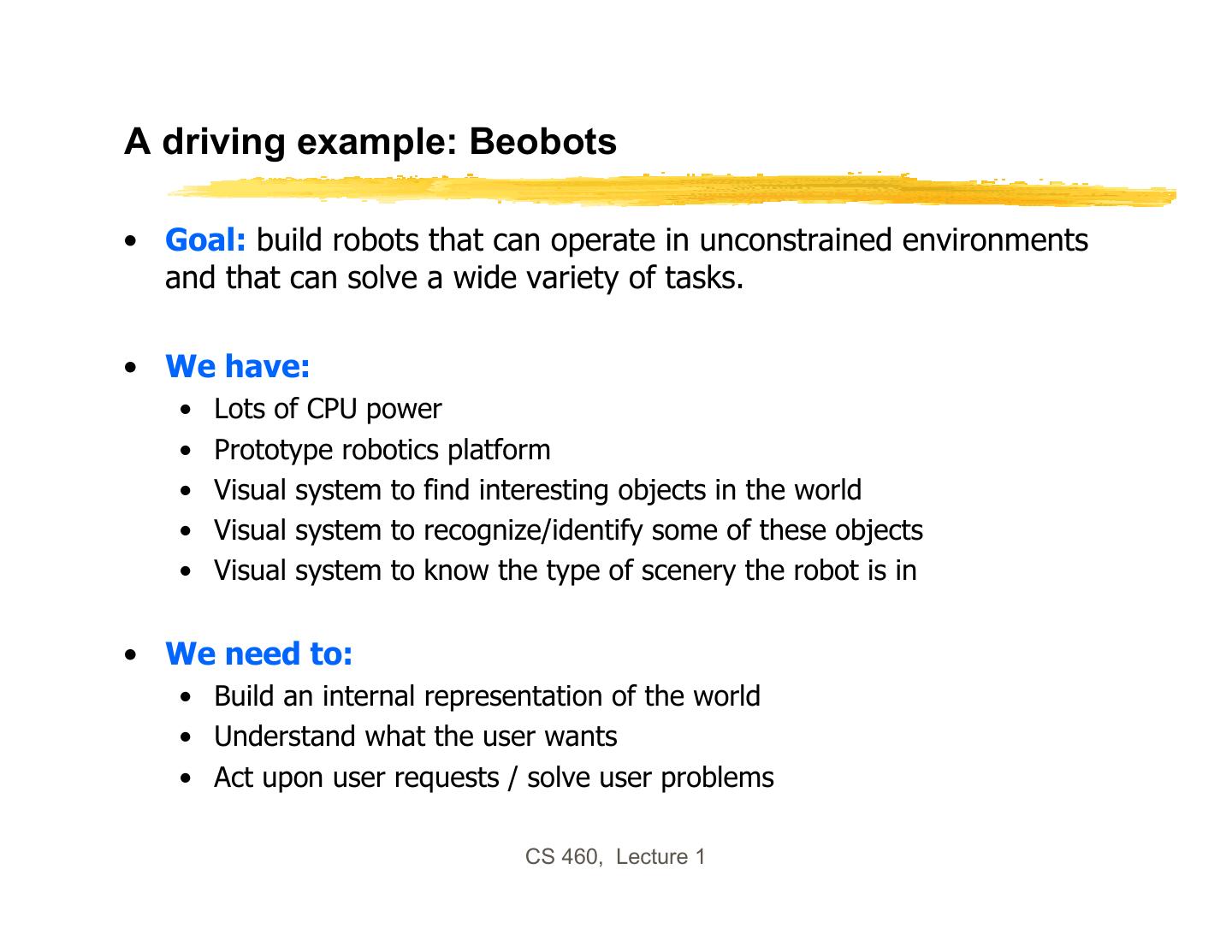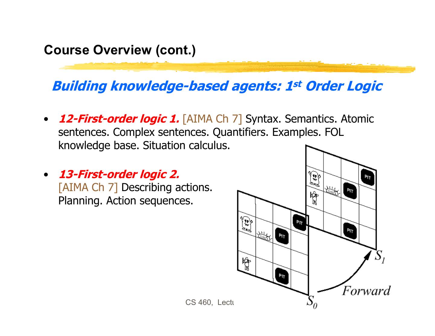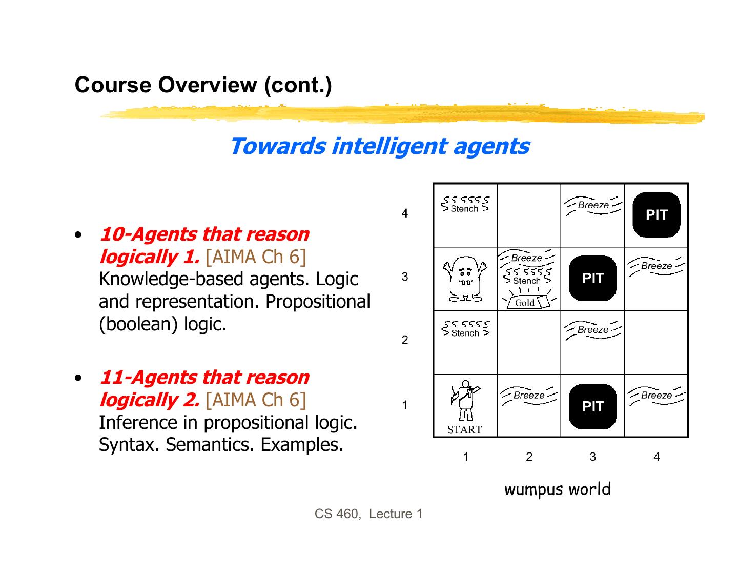 2 .CS 460: Artificial Intelligence • Course overview: foundations of symbolic intelligent systems. Agents, search, problem solving, logic, representation, reasoning, symbolic programming, and robotics. • Prerequisites: CS 455x, i.e., programming principles, discrete mathematics for computing, software design and software engineering concepts. Good knowledge of C++ required for programming assignments. • Grading: 30% for midterm + 30% for final + 40% for mandatory homeworks/assignments CS 460, Lecture 1