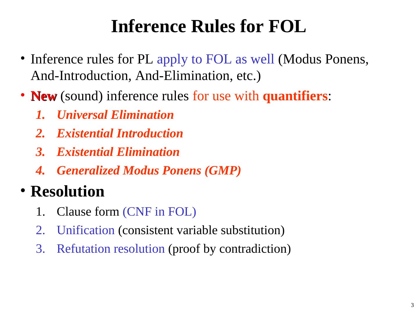 3 . Inference Rules for FOL • Inference rules for PL apply to FOL as well (Modus Ponens, And-Introduction, And-Elimination, etc.) • New (sound) inference rules for use with quantifiers: 1. Universal Elimination 2. Existential Introduction 3. Existential Elimination 4. Generalized Modus Ponens (GMP) • Resolution 1. Clause form (CNF in FOL) 2. Unification (consistent variable substitution) 3. Refutation resolution (proof by contradiction) 3
