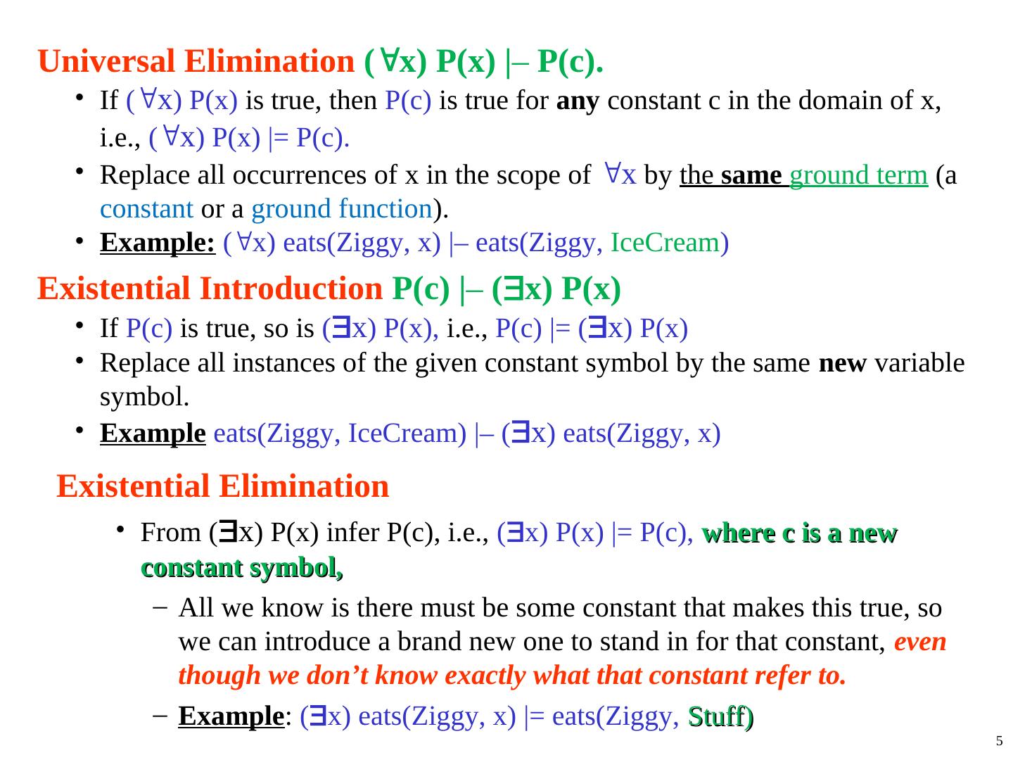 5 .Universal Elimination (x) P(x) |– P(c). • If (x) P(x) is true, then P(c) is true for any constant c in the domain of x, i.e., (x) P(x) |= P(c). • Replace all occurrences of x in the scope of x by the same ground term (a constant or a ground function). • Example: (x) eats(Ziggy, x) |– eats(Ziggy, IceCream) Existential Introduction P(c) |– (x) P(x) • If P(c) is true, so is (x) P(x), i.e., P(c) |= (x) P(x) • Replace all instances of the given constant symbol by the same new variable symbol. • Example eats(Ziggy, IceCream) |– (x) eats(Ziggy, x) Existential Elimination • From (x) P(x) infer P(c), i.e., (x) P(x) |= P(c), where c is a new constant symbol, – All we know is there must be some constant that makes this true, so we can introduce a brand new one to stand in for that constant, even though we don’t know exactly what that constant refer to. – Example: (x) eats(Ziggy, x) |= eats(Ziggy, Stuff) 5