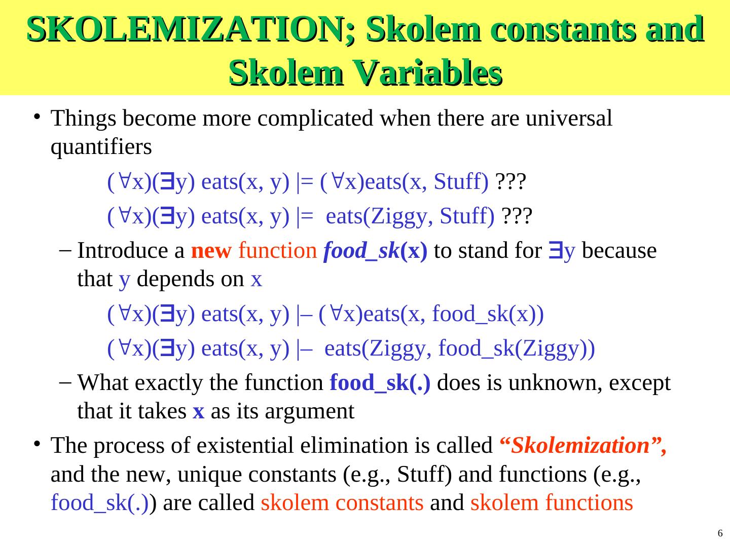 6 .SKOLEMIZATION; Skolem constants and Skolem Variables • Things become more complicated when there are universal quantifiers (x)(y) eats(x, y) |= (x)eats(x, Stuff) ??? (x)(y) eats(x, y) |= eats(Ziggy, Stuff) ??? – Introduce a new function food_sk(x) to stand for y because that y depends on x (x)(y) eats(x, y) |– (x)eats(x, food_sk(x)) (x)(y) eats(x, y) |– eats(Ziggy, food_sk(Ziggy)) – What exactly the function food_sk(.) does is unknown, except that it takes x as its argument • The process of existential elimination is called “Skolemization”, and the new, unique constants (e.g., Stuff) and functions (e.g., food_sk(.)) are called skolem constants and skolem functions 6