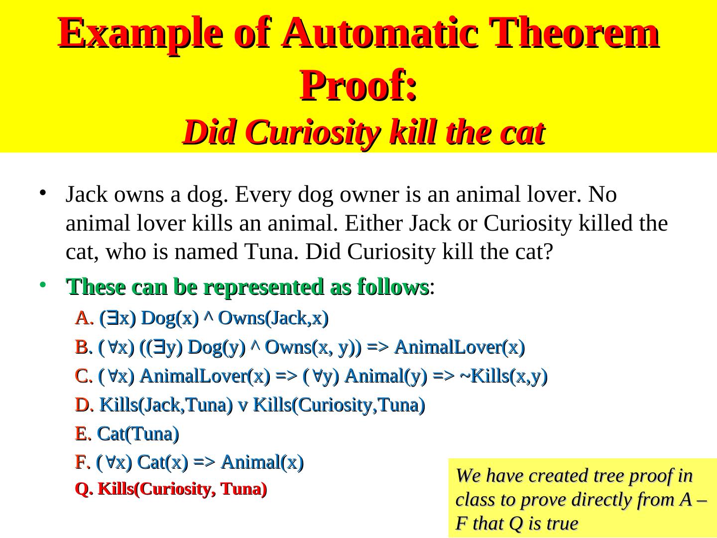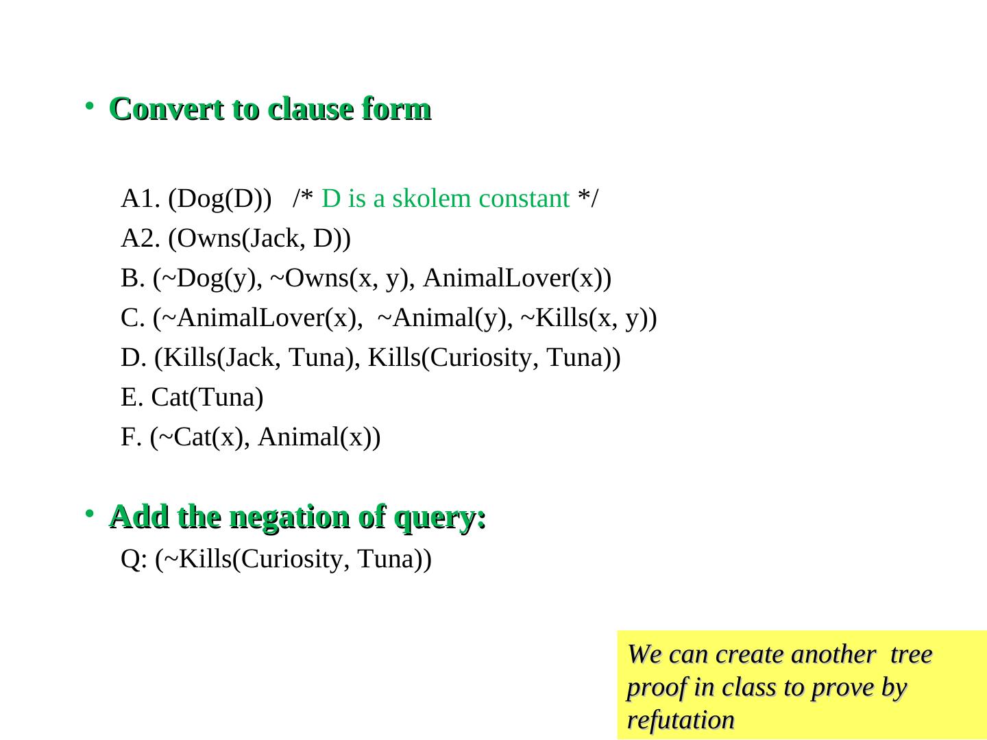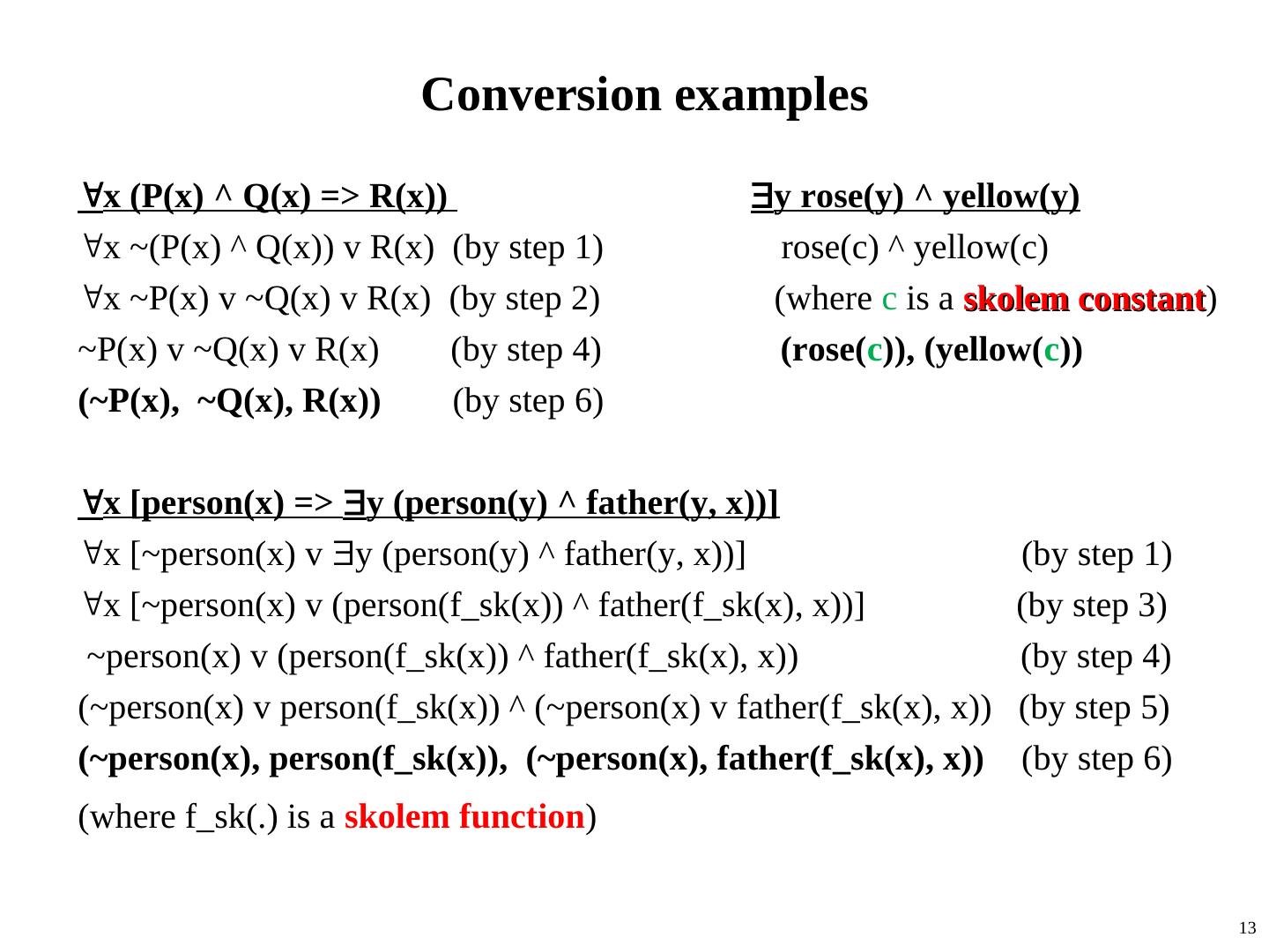 13 . Conversion examples x (P(x) ^ Q(x) => R(x)) y rose(y) ^ yellow(y) x ~(P(x) ^ Q(x)) v R(x) (by step 1) rose(c) ^ yellow(c) x ~P(x) v ~Q(x) v R(x) (by step 2) (where c is a skolem constant) constant ~P(x) v ~Q(x) v R(x) (by step 4) (rose(c)), (yellow(c)) (~P(x), ~Q(x), R(x)) (by step 6) x [person(x) => y (person(y) ^ father(y, x))] x [~person(x) v y (person(y) ^ father(y, x))] (by step 1) x [~person(x) v (person(f_sk(x)) ^ father(f_sk(x), x))] (by step 3) ~person(x) v (person(f_sk(x)) ^ father(f_sk(x), x)) (by step 4) (~person(x) v person(f_sk(x)) ^ (~person(x) v father(f_sk(x), x)) (by step 5) (~person(x), person(f_sk(x)), (~person(x), father(f_sk(x), x)) (by step 6) (where f_sk(.) is a skolem function) 13