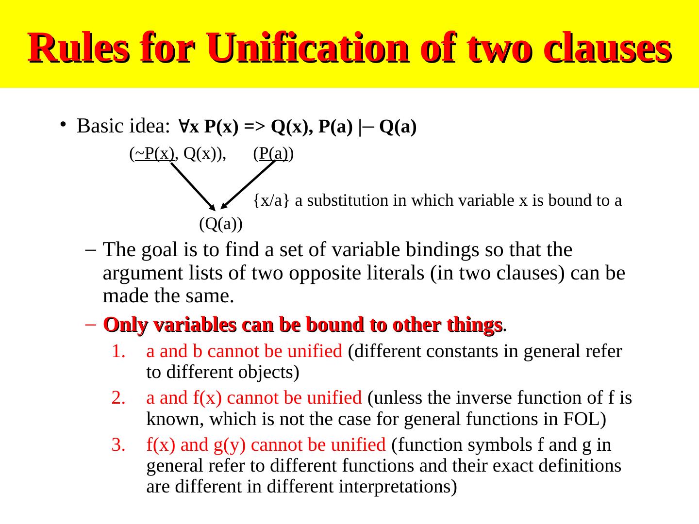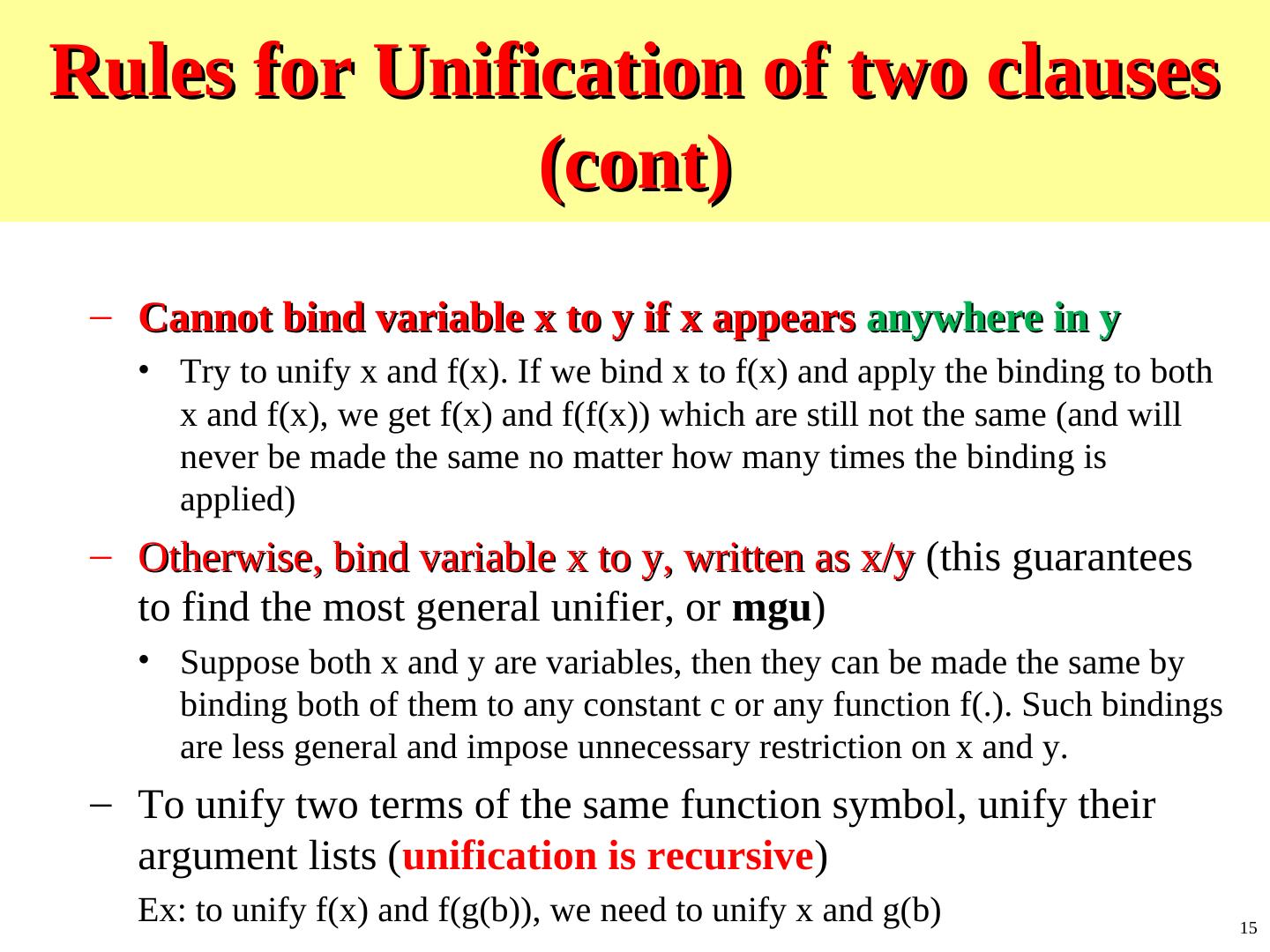 14 .Rules for Unification of two clauses • Basic idea: x P(x) => Q(x), P(a) |– Q(a) (~P(x), Q(x)), (P(a)) {x1/y1, ... xk/yk} where x1, ... xk are variables and x/a} a substitution in which variable x is bound to a (Q(a)) – The goal is to find a set of variable bindings so that the argument lists of two opposite literals (in two clauses) can be made the same. – Only variables can be bound to other things. things 1. a and b cannot be unified (different constants in general refer to different objects) 2. a and f(x) cannot be unified (unless the inverse function of f is known, which is not the case for general functions in FOL) 3. f(x) and g(y) cannot be unified (function symbols f and g in general refer to different functions and their exact definitions are different in different interpretations)