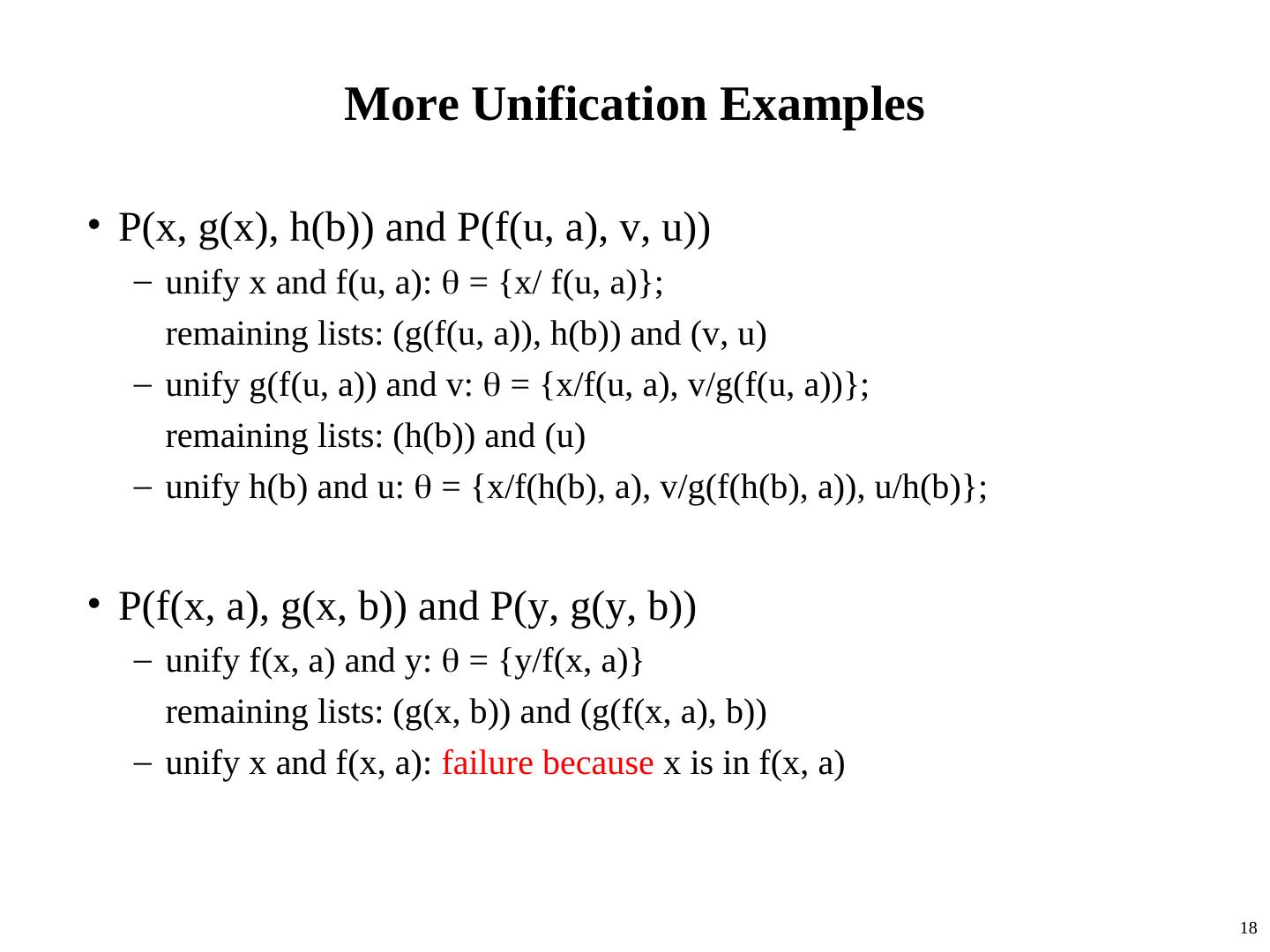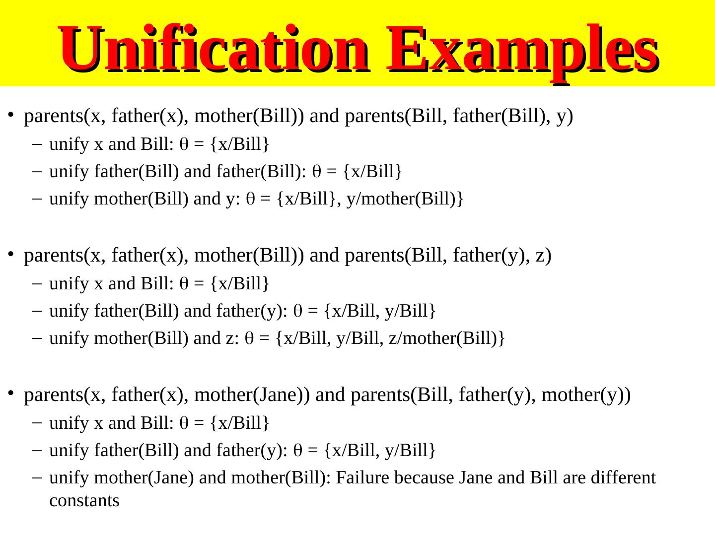 17 . Unification Examples • parents(x, father(x), mother(Bill)) and parents(Bill, father(Bill), y) – unify x and Bill: = {x1/y1, ... xk/yk} where x1, ... xk are variables and x/Bill} – unify father(Bill) and father(Bill): = {x1/y1, ... xk/yk} where x1, ... xk are variables and x/Bill} – unify mother(Bill) and y: = {x1/y1, ... xk/yk} where x1, ... xk are variables and x/Bill}, y/mother(Bill)} • parents(x, father(x), mother(Bill)) and parents(Bill, father(y), z) – unify x and Bill: = {x1/y1, ... xk/yk} where x1, ... xk are variables and x/Bill} – unify father(Bill) and father(y): = {x1/y1, ... xk/yk} where x1, ... xk are variables and x/Bill, y/Bill} – unify mother(Bill) and z: = {x1/y1, ... xk/yk} where x1, ... xk are variables and x/Bill, y/Bill, z/mother(Bill)} • parents(x, father(x), mother(Jane)) and parents(Bill, father(y), mother(y)) – unify x and Bill: = {x1/y1, ... xk/yk} where x1, ... xk are variables and x/Bill} – unify father(Bill) and father(y): = {x1/y1, ... xk/yk} where x1, ... xk are variables and x/Bill, y/Bill} – unify mother(Jane) and mother(Bill): Failure because Jane and Bill are different constants
