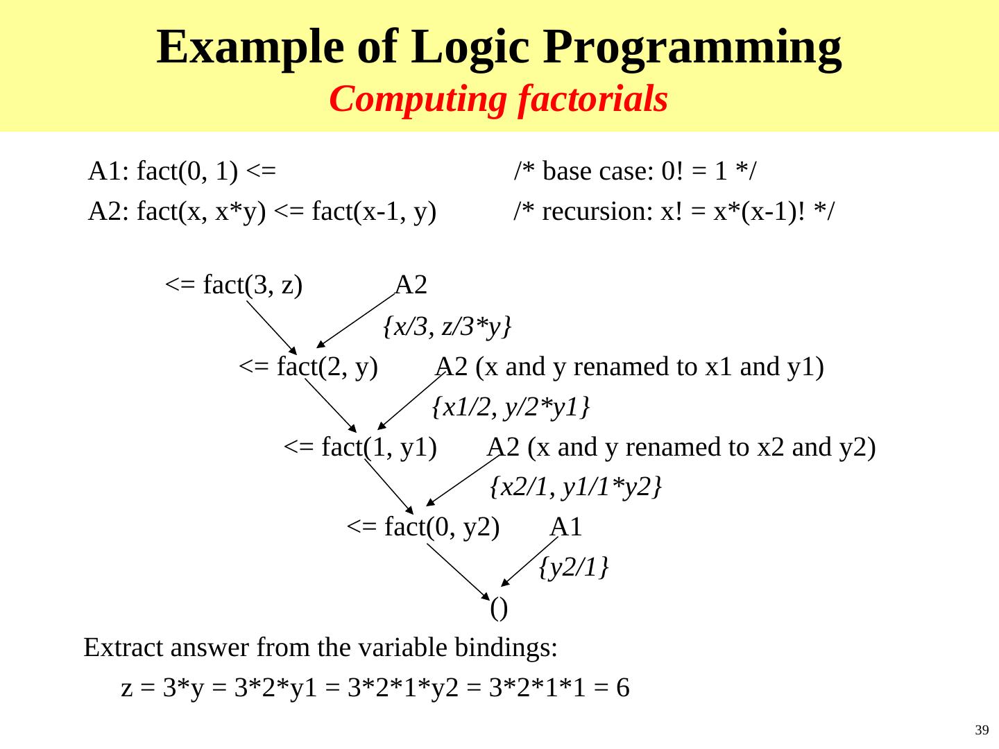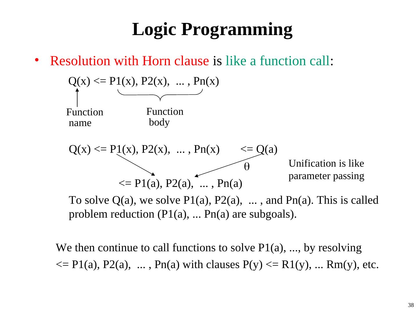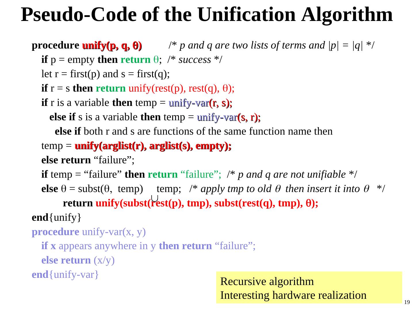 19 .Pseudo-Code of the Unification Algorithm procedure unify(p, q, ) /* p and q are two lists of terms and |p| = |q| */ if p = empty then return ; /* success */ let r = first(p) and s = first(q); if r = s then return unify(rest(p), rest(q), ); if r is a variable then temp = unify-var(r, s); else if s is a variable then temp = unify-var(s, r); else if both r and s are functions of the same function name then temp = unify(arglist(r), arglist(s), empty); else return “failure”; if temp = “failure” then return “failure”; /* p and q are not unifiable */ else = subst(temp) temp; /* apply tmp to old then insert it into */ return unify(subst(rest(p), tmp), subst(rest(q), tmp), ); end{x1/y1, ... xk/yk} where x1, ... xk are variables and unify} procedure unify-var(x, y) if x appears anywhere in y then return “failure”; else return (x/y) end{x1/y1, ... xk/yk} where x1, ... xk are variables and unify-var} Recursive algorithm Interesting hardware realization 19