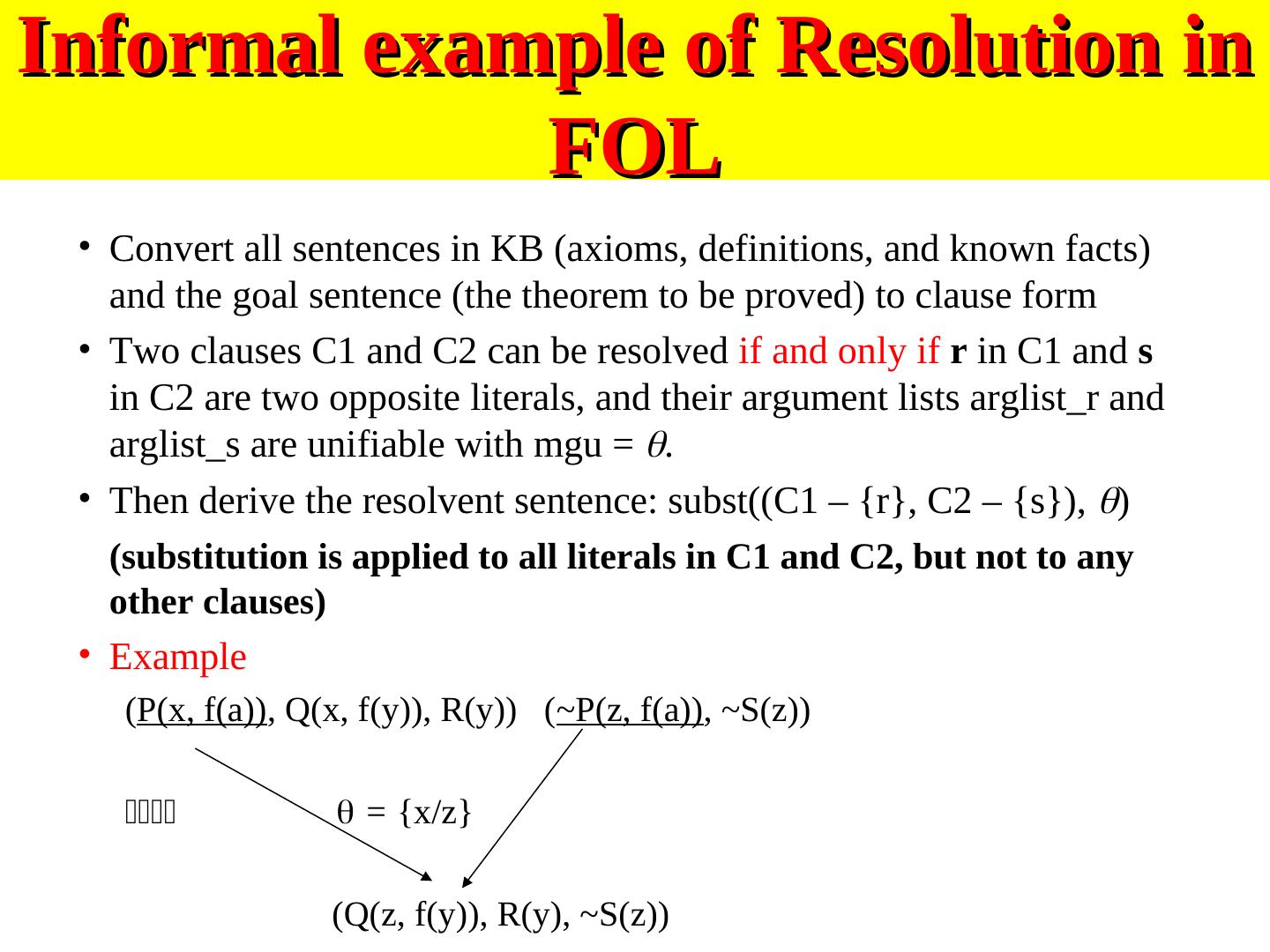 20 .Informal example of Resolution in FOL • Convert all sentences in KB (axioms, definitions, and known facts) and the goal sentence (the theorem to be proved) to clause form • Two clauses C1 and C2 can be resolved if and only if r in C1 and s in C2 are two opposite literals, and their argument lists arglist_r and arglist_s are unifiable with mgu = . • Then derive the resolvent sentence: subst((C1 – {x1/y1, ... xk/yk} where x1, ... xk are variables and r}, C2 – {x1/y1, ... xk/yk} where x1, ... xk are variables and s}), ) (substitution is applied to all literals in C1 and C2, but not to any other clauses) • Example (P(x, f(a)), Q(x, f(y)), R(y)) (~P(z, f(a)), ~S(z)) = {x1/y1, ... xk/yk} where x1, ... xk are variables and x/z} (Q(z, f(y)), R(y), ~S(z))