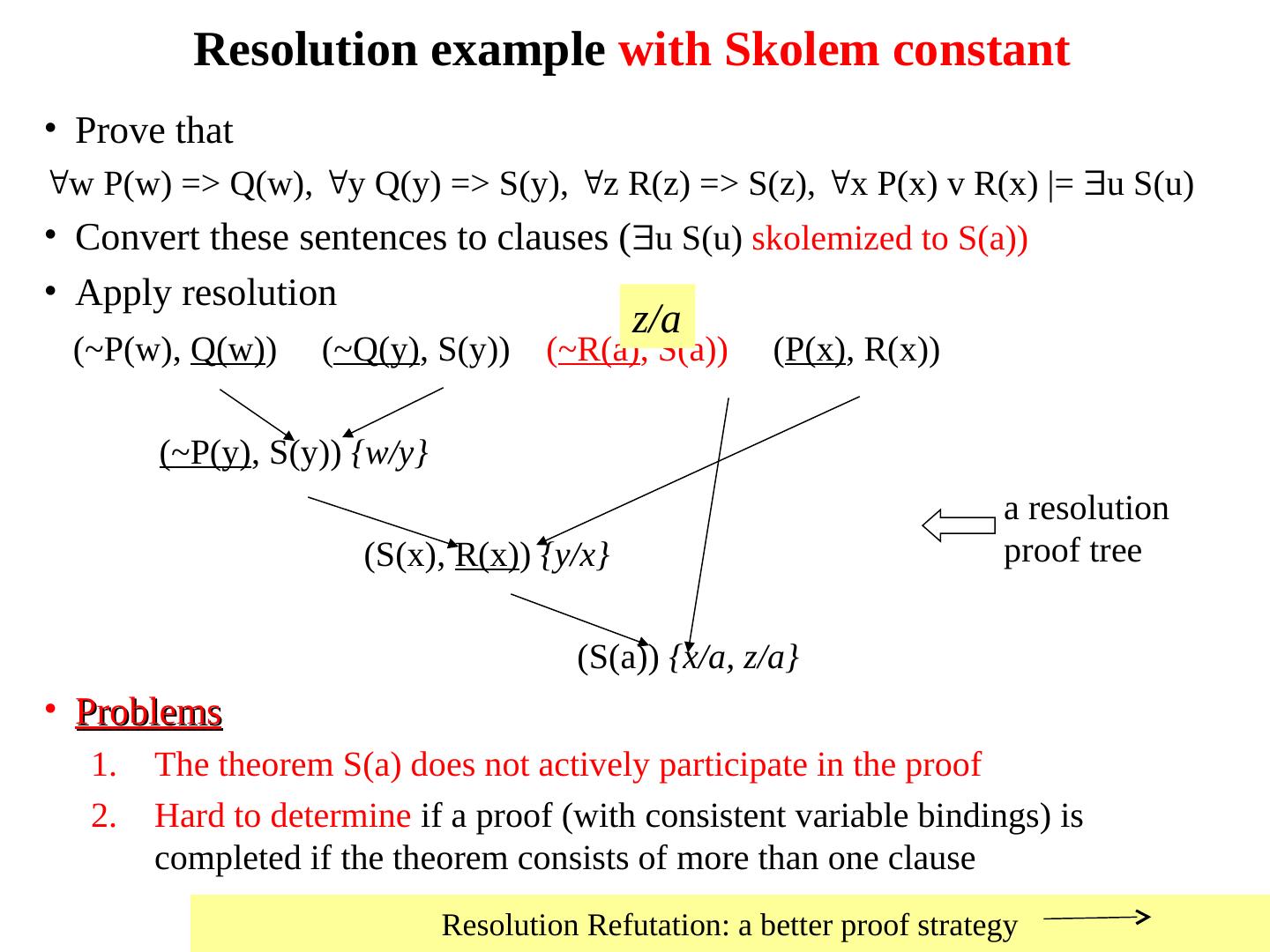 21 . Resolution example with Skolem constant • Prove that w P(w) => Q(w), y Q(y) => S(y), z R(z) => S(z), x P(x) v R(x) |= u S(u) • Convert these sentences to clauses (u S(u) skolemized to S(a)) • Apply resolution z/a (~P(w), Q(w)) (~Q(y), S(y)) (~R(a), S(a)) (P(x), R(x)) (~P(y), S(y)) {w/y} a resolution (S(x), R(x)) {y/x} proof tree (S(a)) {x/a, z/a} • Problems 1. The theorem S(a) does not actively participate in the proof 2. Hard to determine if a proof (with consistent variable bindings) is completed if the theorem consists of more than one clause Resolution Refutation: a better proof strategy 21