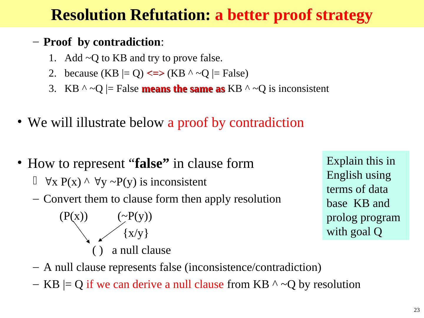 23 . Resolution Refutation: a better proof strategy – Proof by contradiction: 1. Add ~Q to KB and try to prove false. 2. because (KB |= Q) <=> (KB ^ ~Q |= False) 3. KB ^ ~Q |= False means the same as KB ^ ~Q is inconsistent • We will illustrate below a proof by contradiction • How to represent “false” in clause form Explain this in x P(x) ^ y ~P(y) is inconsistent English using terms of data – Convert them to clause form then apply resolution base KB and (P(x)) (~P(y)) prolog program with goal Q {x1/y1, ... xk/yk} where x1, ... xk are variables and x/y} ( ) a null clause – A null clause represents false (inconsistence/contradiction) – KB |= Q if we can derive a null clause from KB ^ ~Q by resolution 23