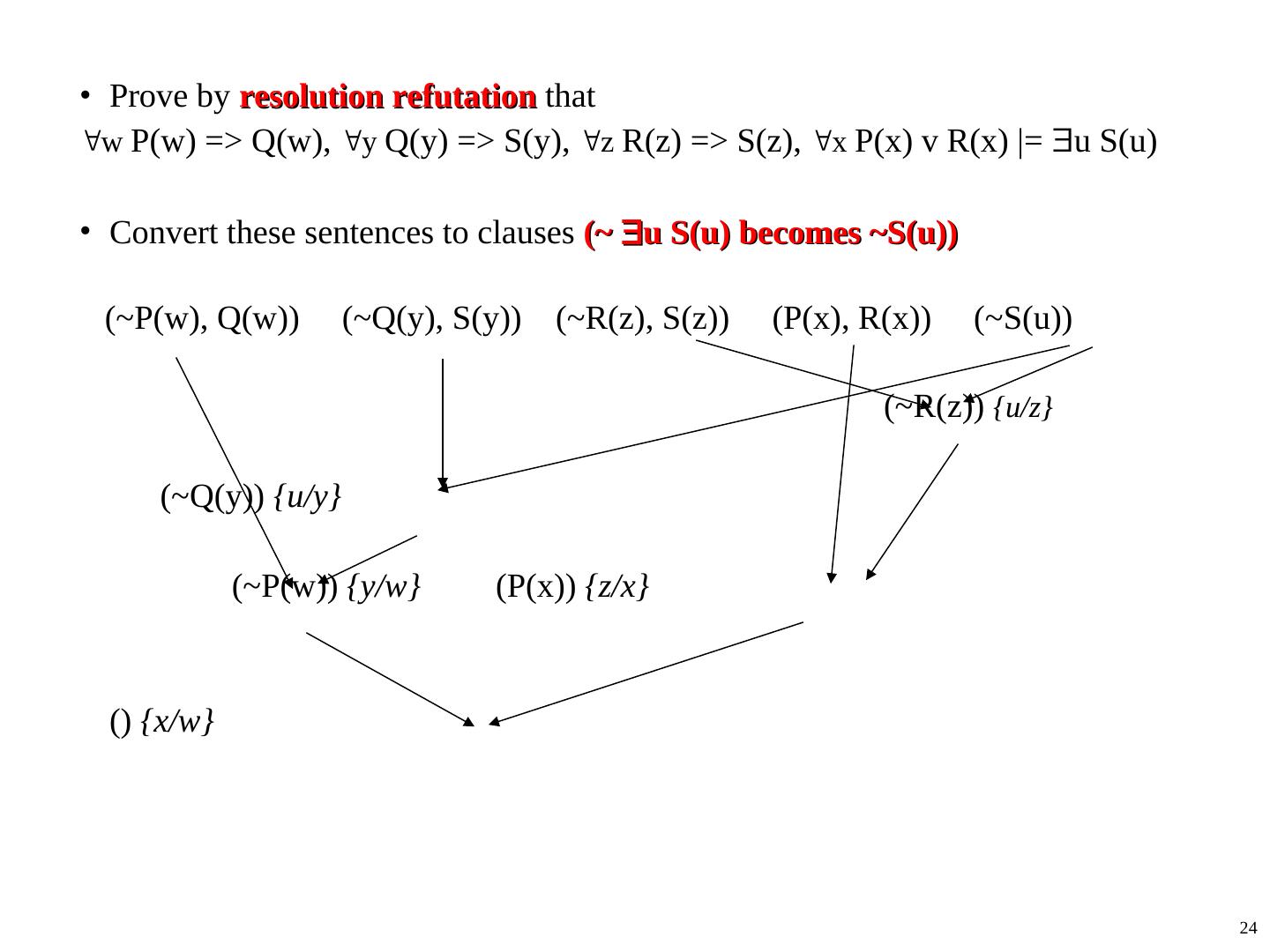 24 .• Prove by resolution refutation that w P(w) => Q(w), y Q(y) => S(y), z R(z) => S(z), x P(x) v R(x) |= u S(u) • Convert these sentences to clauses (~ u S(u) becomes ~S(u)) (~P(w), Q(w)) (~Q(y), S(y)) (~R(z), S(z)) (P(x), R(x)) (~S(u)) (~R(z)) {u/z} (~Q(y)) {u/y} (~P(w)) {y/w} (P(x)) {z/x} () {x/w} 24