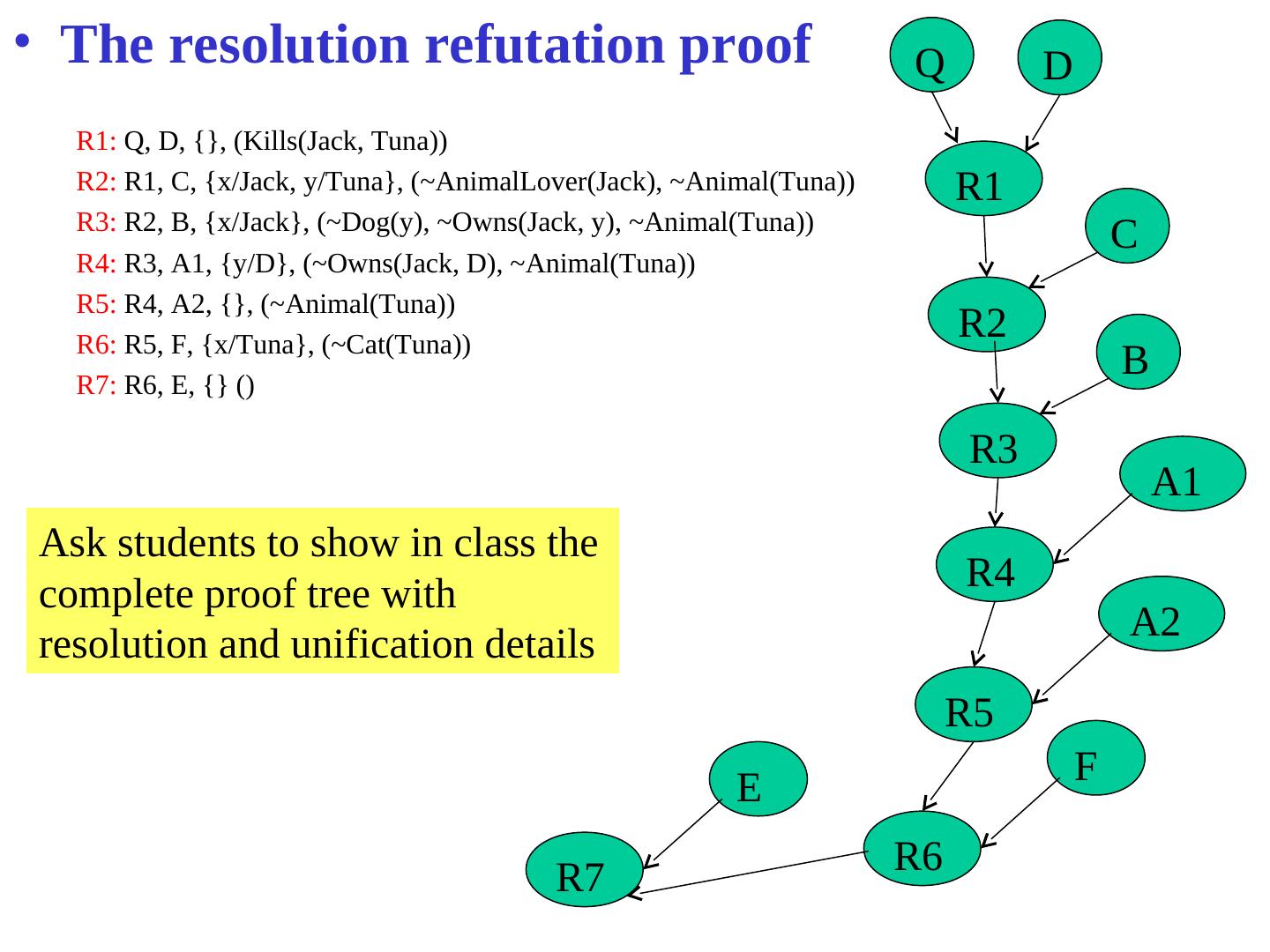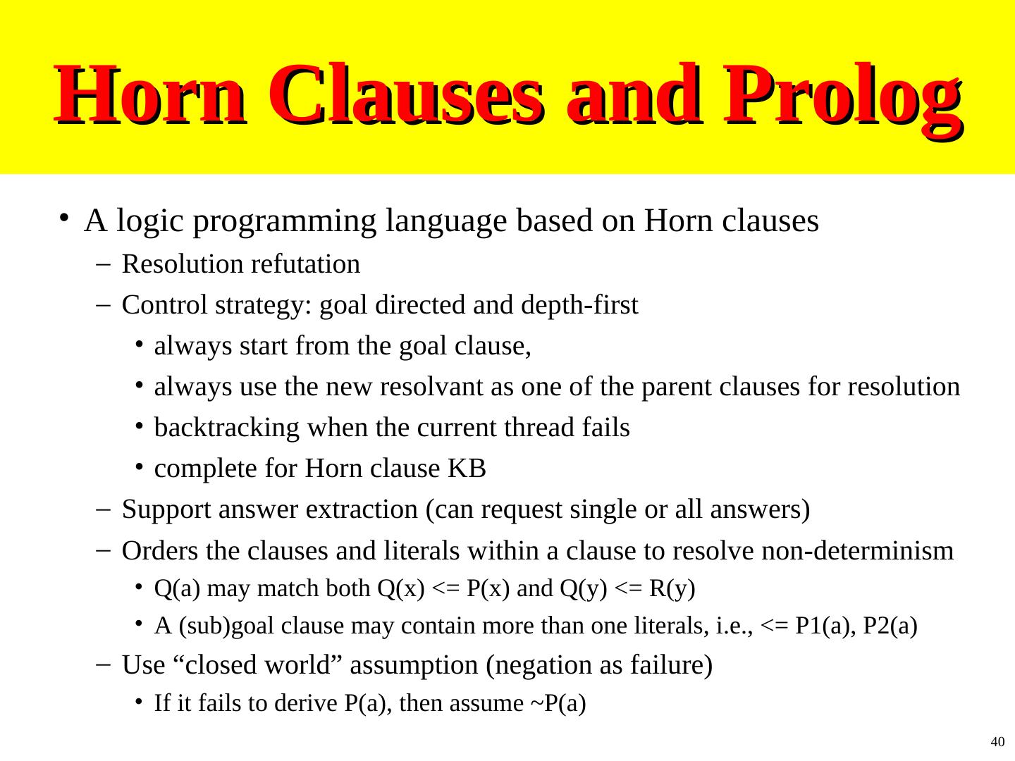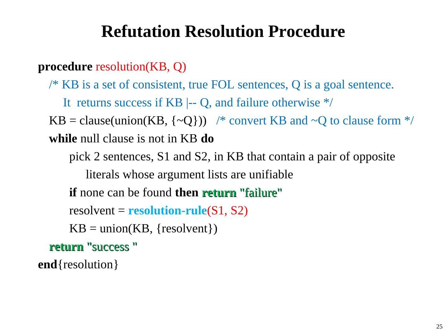 25 . Refutation Resolution Procedure procedure resolution(KB, Q) /* KB is a set of consistent, true FOL sentences, Q is a goal sentence. It returns success if KB |-- Q, and failure otherwise */ KB = clause(union(KB, {x1/y1, ... xk/yk} where x1, ... xk are variables and ~Q})) /* convert KB and ~Q to clause form */ while null clause is not in KB do pick 2 sentences, S1 and S2, in KB that contain a pair of opposite literals whose argument lists are unifiable if none can be found then return "failure" resolvent = resolution-rule(S1, S2) KB = union(KB, {x1/y1, ... xk/yk} where x1, ... xk are variables and resolvent}) return "success " end{x1/y1, ... xk/yk} where x1, ... xk are variables and resolution} 25
