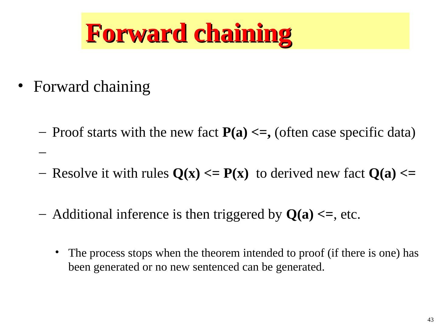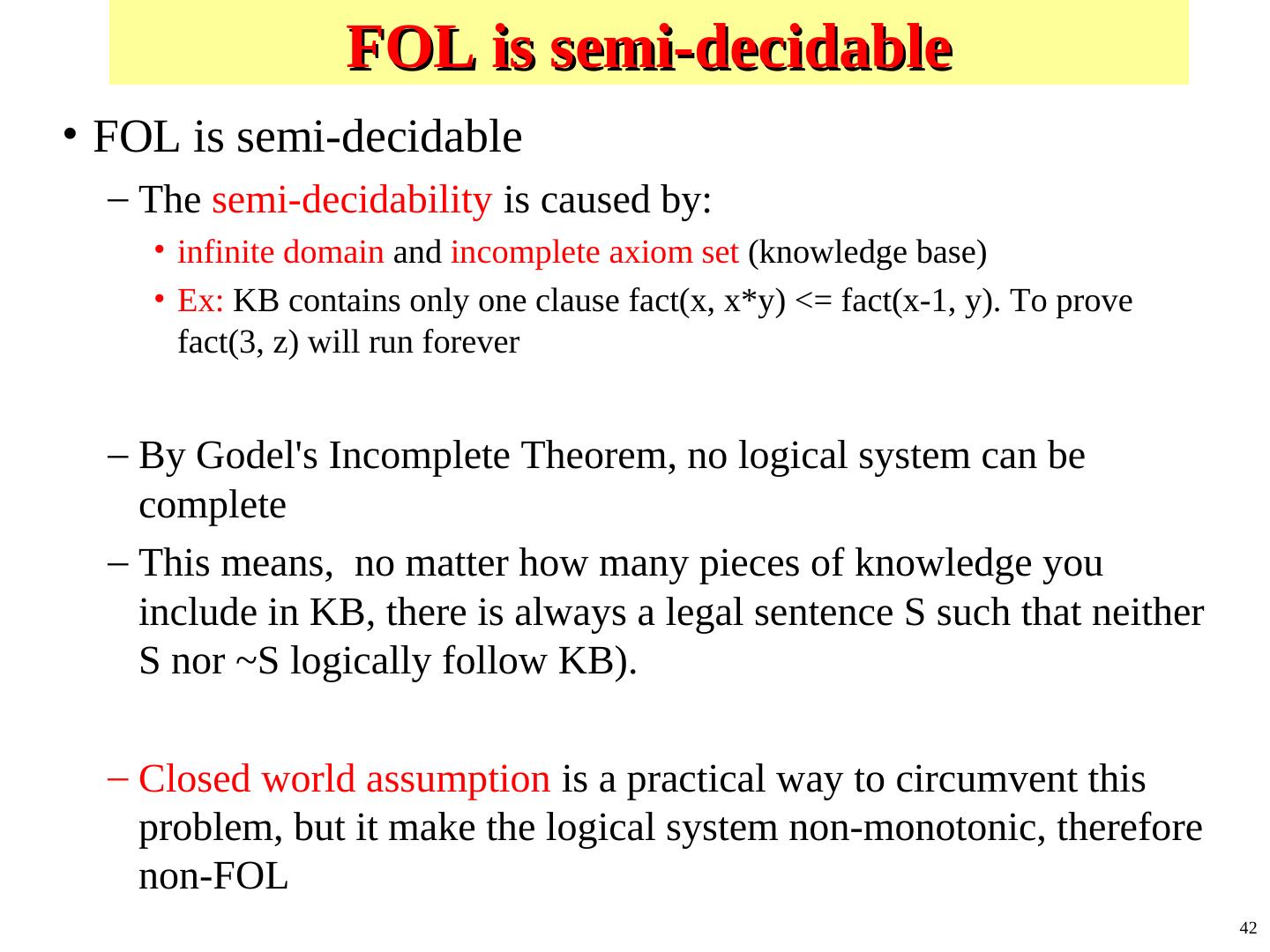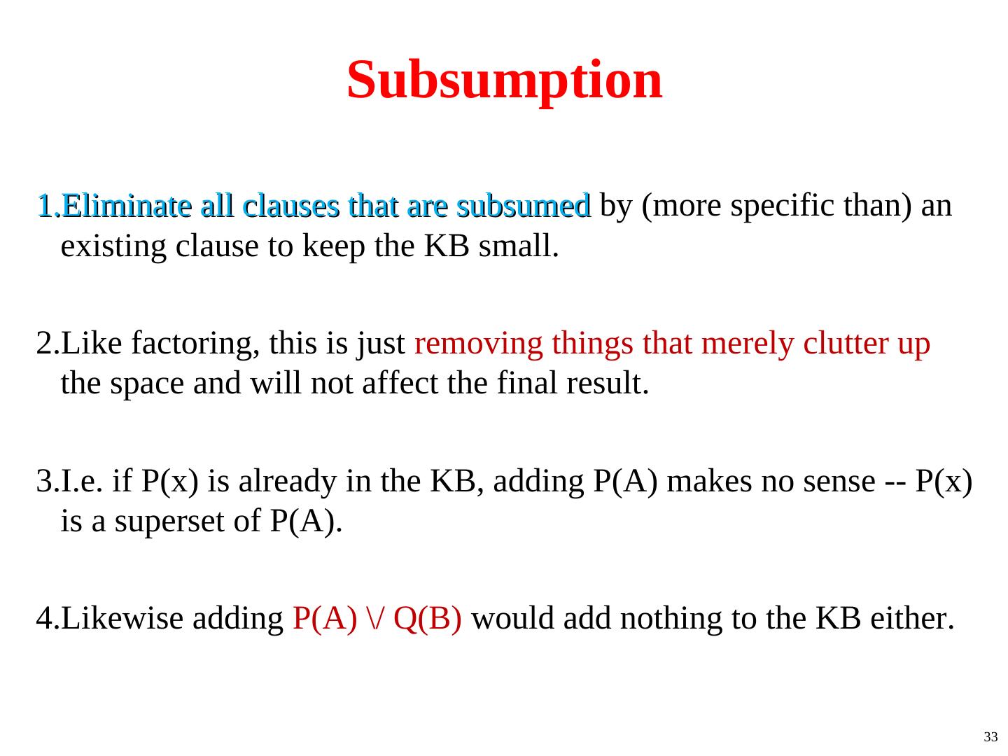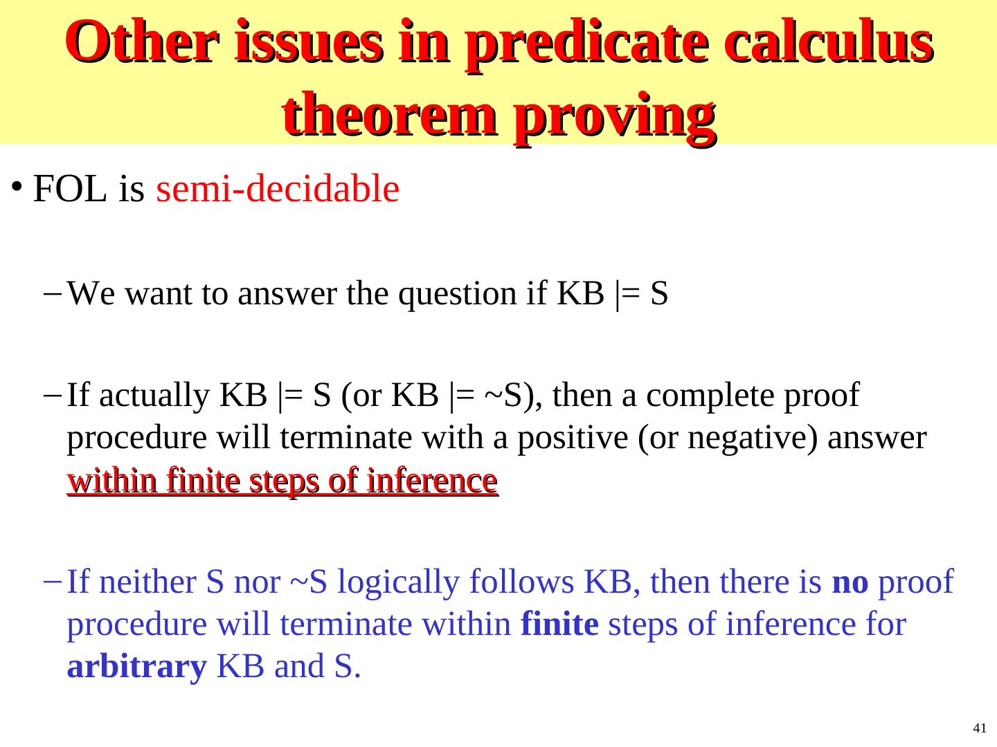 25 . Refutation Resolution Procedure procedure resolution(KB, Q) /* KB is a set of consistent, true FOL sentences, Q is a goal sentence. It returns success if KB |-- Q, and failure otherwise */ KB = clause(union(KB, {x1/y1, ... xk/yk} where x1, ... xk are variables and ~Q})) /* convert KB and ~Q to clause form */ while null clause is not in KB do pick 2 sentences, S1 and S2, in KB that contain a pair of opposite literals whose argument lists are unifiable if none can be found then return "failure" resolvent = resolution-rule(S1, S2) KB = union(KB, {x1/y1, ... xk/yk} where x1, ... xk are variables and resolvent}) return "success " end{x1/y1, ... xk/yk} where x1, ... xk are variables and resolution} 25