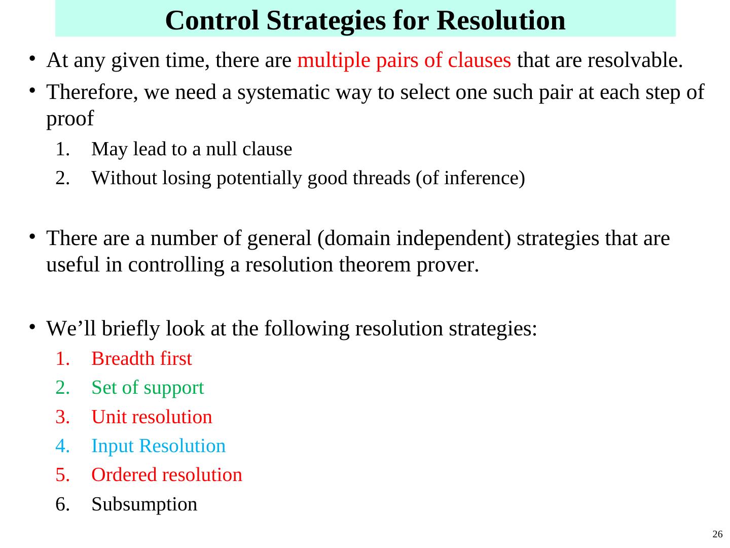 26 . Control Strategies for Resolution • At any given time, there are multiple pairs of clauses that are resolvable. • Therefore, we need a systematic way to select one such pair at each step of proof 1. May lead to a null clause 2. Without losing potentially good threads (of inference) • There are a number of general (domain independent) strategies that are useful in controlling a resolution theorem prover. • We’ll briefly look at the following resolution strategies: 1. Breadth first 2. Set of support 3. Unit resolution 4. Input Resolution 5. Ordered resolution 6. Subsumption 26