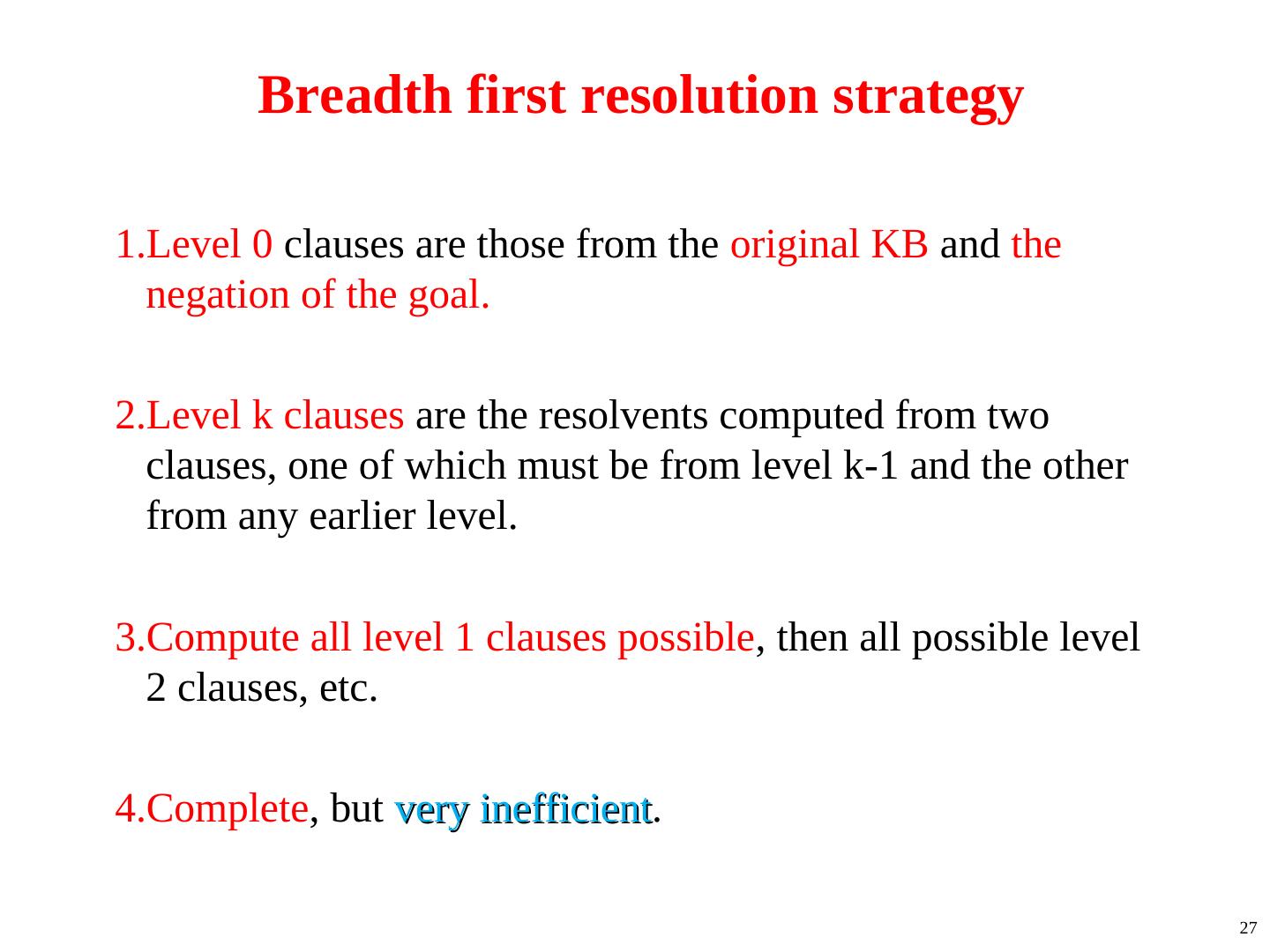 27 . Breadth first resolution strategy 1.Level 0 clauses are those from the original KB and the negation of the goal. 2.Level k clauses are the resolvents computed from two clauses, one of which must be from level k-1 and the other from any earlier level. 3.Compute all level 1 clauses possible, then all possible level 2 clauses, etc. 4.Complete, but very inefficient. inefficient 27