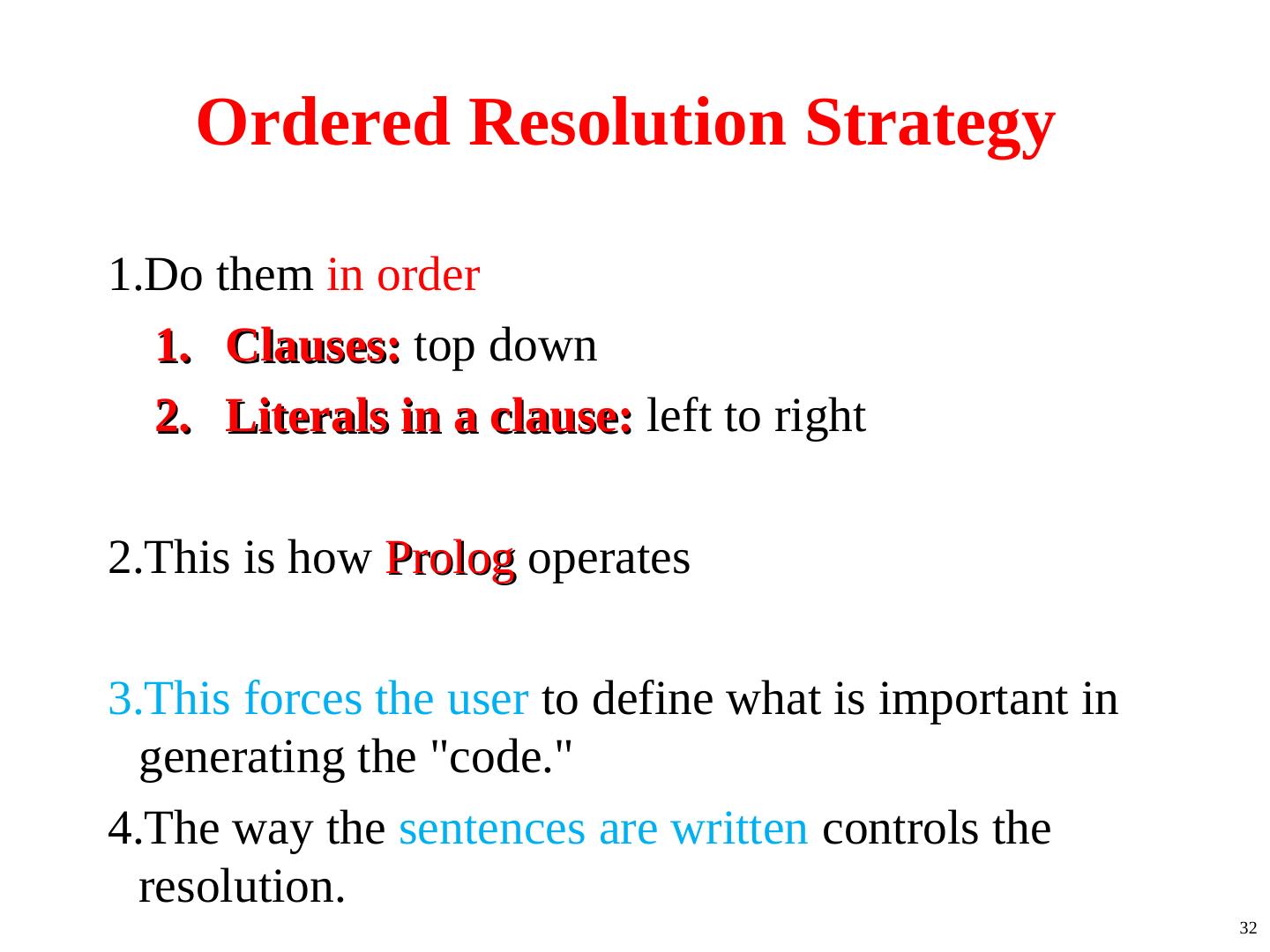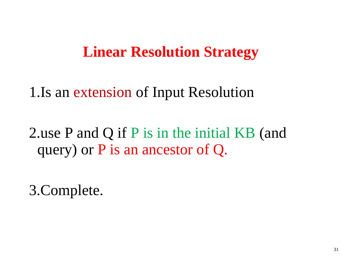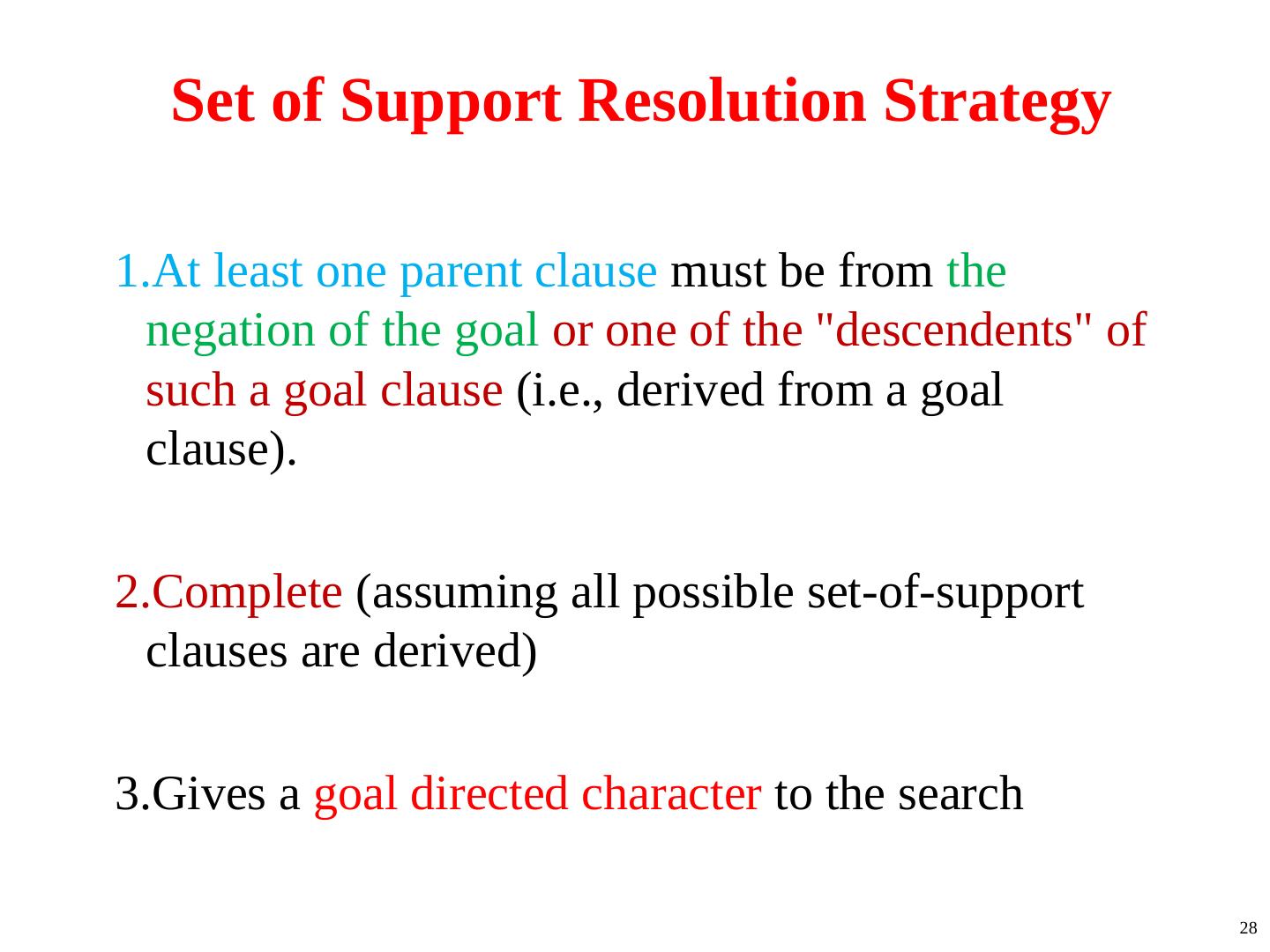 28 . Set of Support Resolution Strategy 1.At least one parent clause must be from the negation of the goal or one of the "descendents" of such a goal clause (i.e., derived from a goal clause). 2.Complete (assuming all possible set-of-support clauses are derived) 3.Gives a goal directed character to the search 28