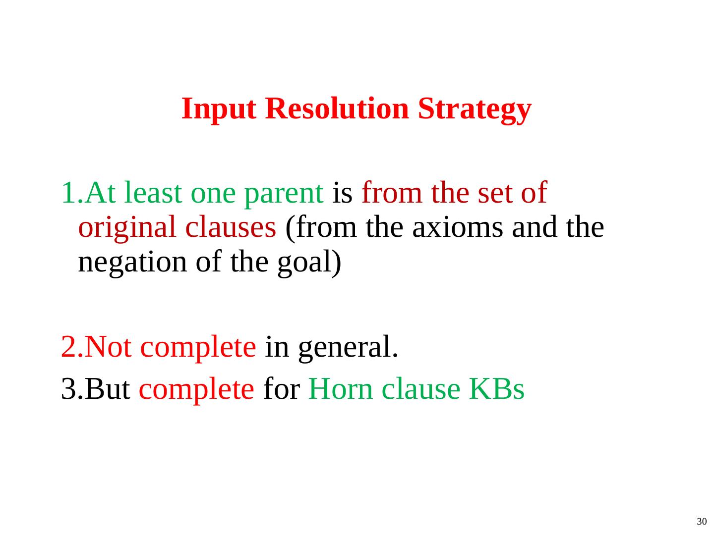 29 . Unit Resolution Strategy 1.At least one parent clause must be a "unit clause," i.e., a clause containing a single literal. 2.Not complete in general 3.But complete for Horn clause KBs 29