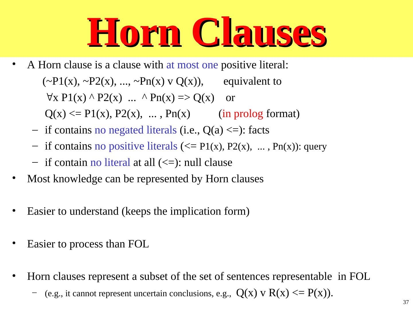 12 .Conversion procedure to CNF step 1: remove all “=>” and “<=>” operators (using P => Q make ~P v Q and P <=> Q make to P => Q ^ Q => P) step 2: move all negation signs to individual predicates (using de Morgan’s law) step 3: remove all existential quantifiers y case 1: y is not in the scope of any universally quantified variable, then replace all occurrences of y by a skolem constant case 2: if y is in scope of universally quantified variables x1, ... xi, then replace all occurrences of y by a skolem function with x1, ... xi are its argument step 4: remove all universal quantifiers x (with the understanding that all remaining variables are universally quantified) step 5: convert the sentence into CNF (using distribution law, etc) step 6: use parenthesis to separate all disjunctions, then drop all v’s and ^’s