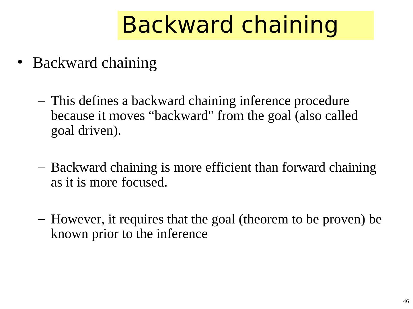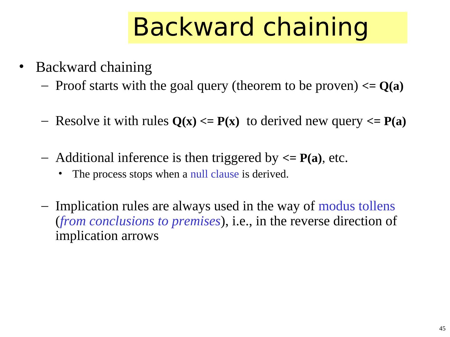 16 .Rules for Unification of two clauses (cont) – When the argument lists contain multiple terms, unify each pair of terms Ex. To unify (x, f(x), ...) (a, y, ...) 1. unify x and a (x/a}) 2. apply to the remaining terms in both lists, resulting (f(a), ...) and (y, ...) 3. unify f(a) and y with binding y/f(a) 4. apply the new binding y/f(a) to and to the rest of the two lists 5. add y/f(a) to new most general unifier 16