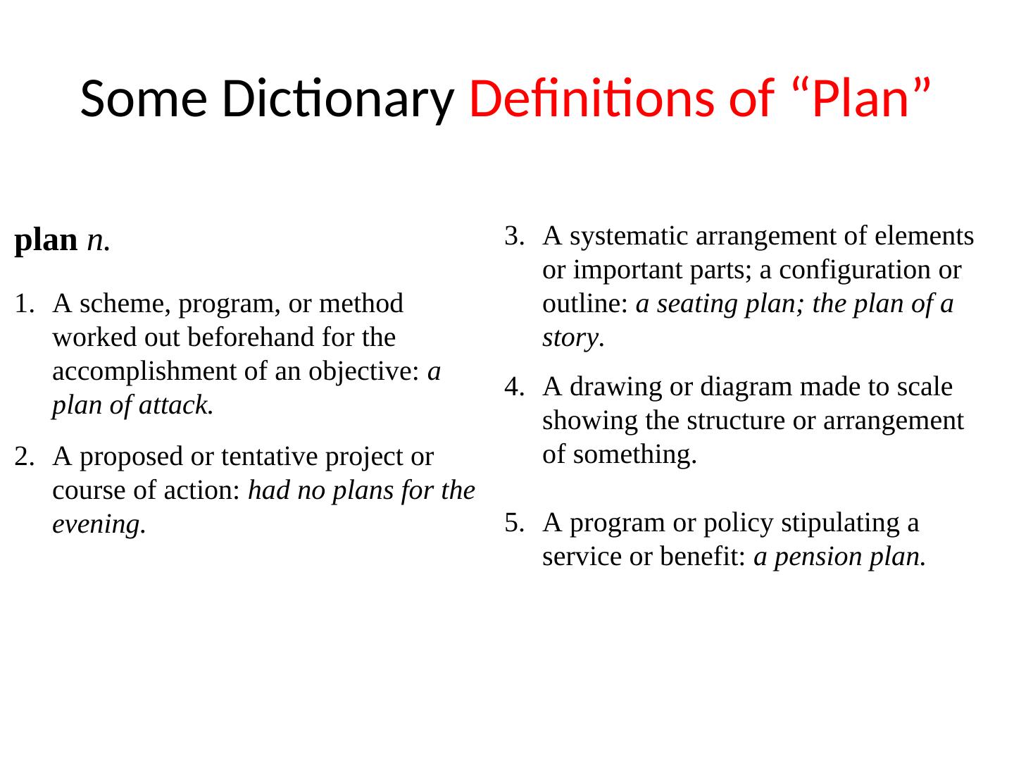 2 . Some Dictionary Definitions of “Plan” plan n. 3. A systematic arrangement of elements or important parts; a configuration or 1. A scheme, program, or method outline: a seating plan; the plan of a worked out beforehand for the story. accomplishment of an objective: a 4. A drawing or diagram made to scale plan of attack. showing the structure or arrangement 2. A proposed or tentative project or of something. course of action: had no plans for the evening. 5. A program or policy stipulating a service or benefit: a pension plan.