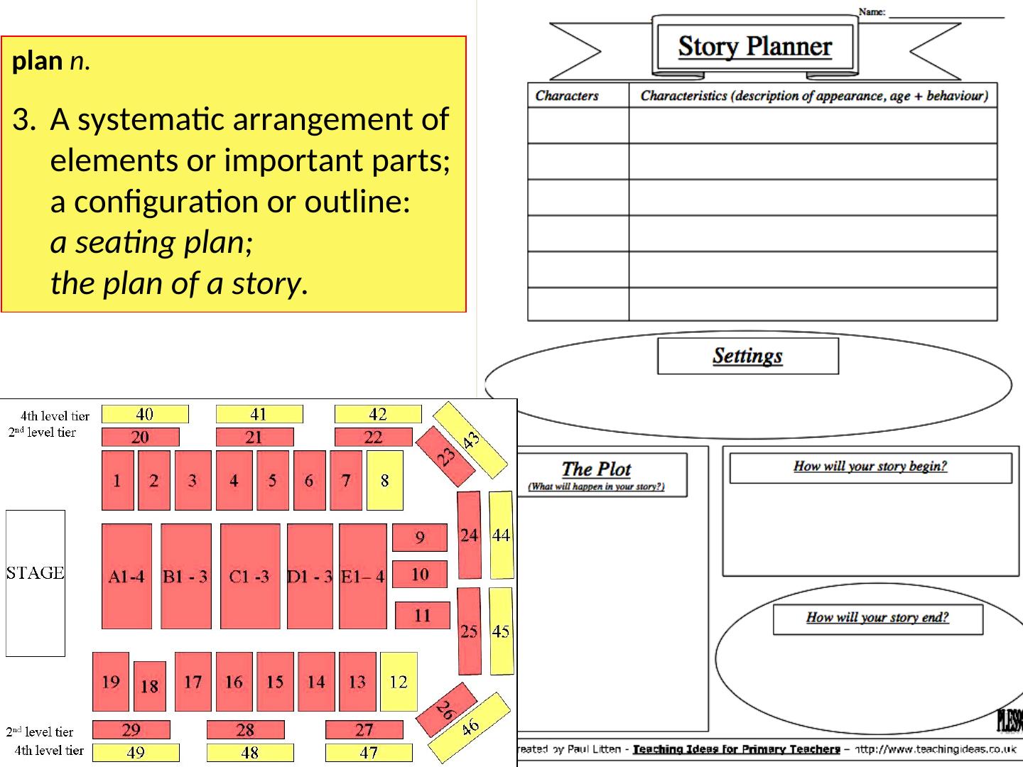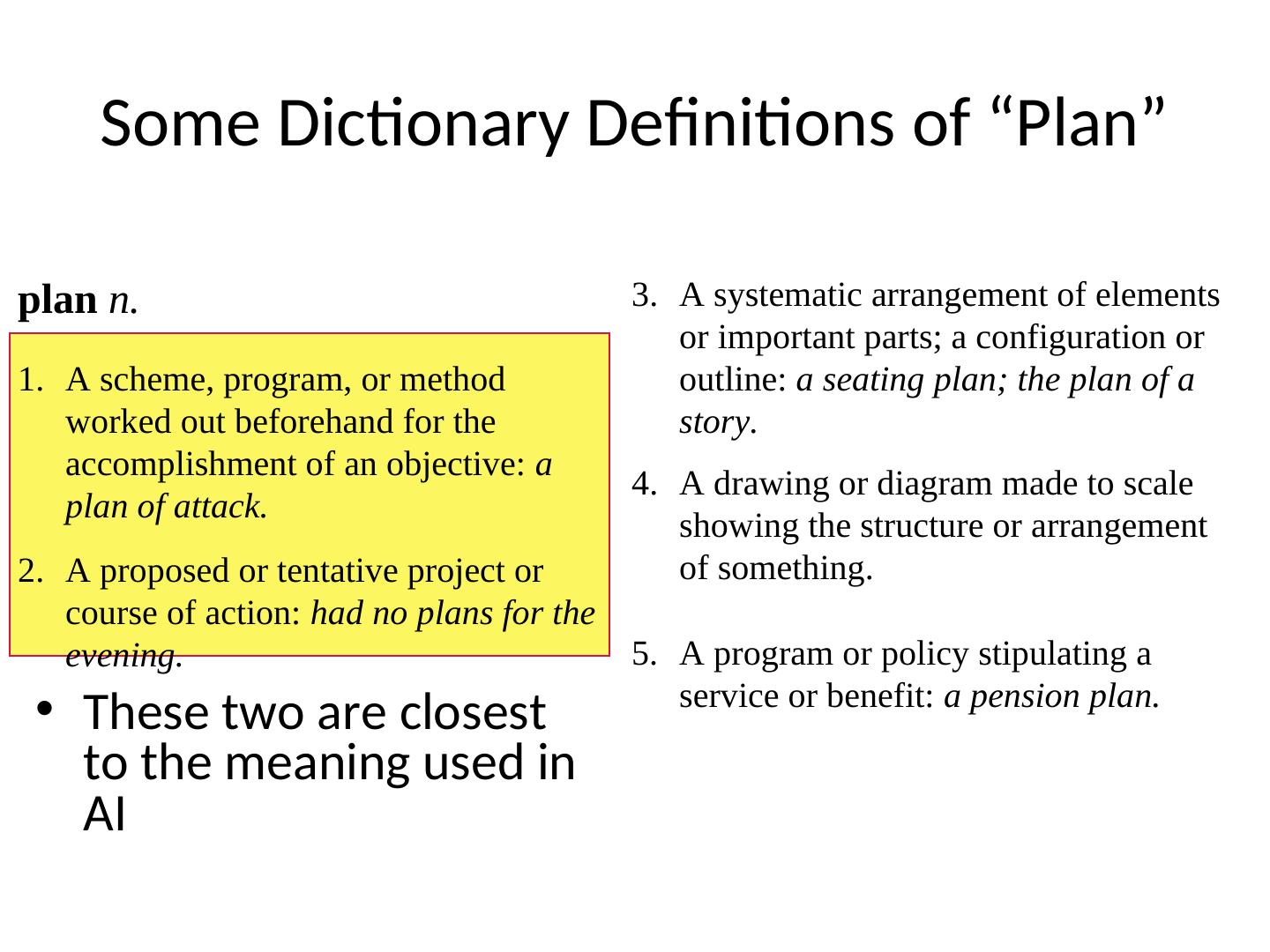 5 .plan n. 3. A systematic arrangement of elements or important parts; a configuration or outline: a seating plan; the plan of a story. Dana Nau: Lecture slides for Automated Planning Licensed under the Creative Commons Attribution-NonCommercial-ShareAlike License: http://creativecommons.org/licenses/by-nc-sa/2.0/