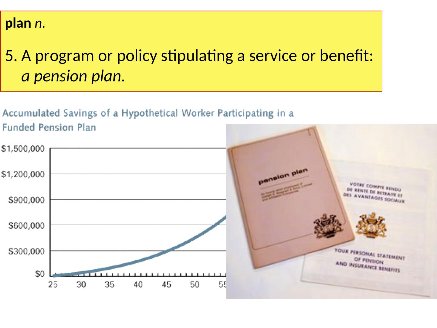 7 .plan n. 5. A program or policy stipulating a service or benefit: a pension plan.