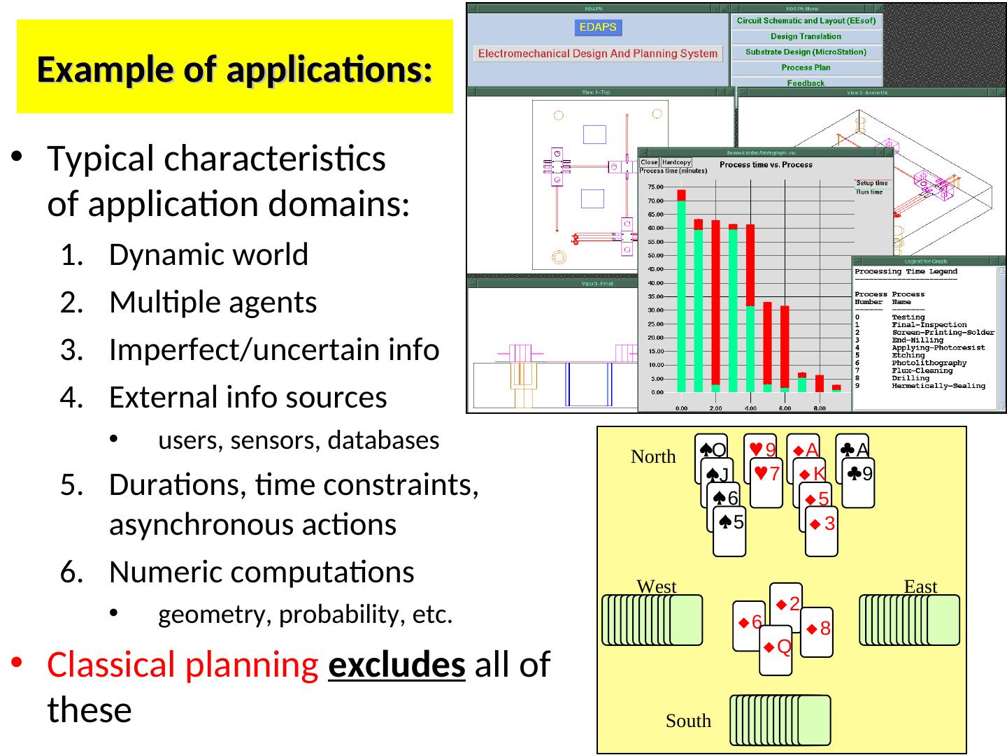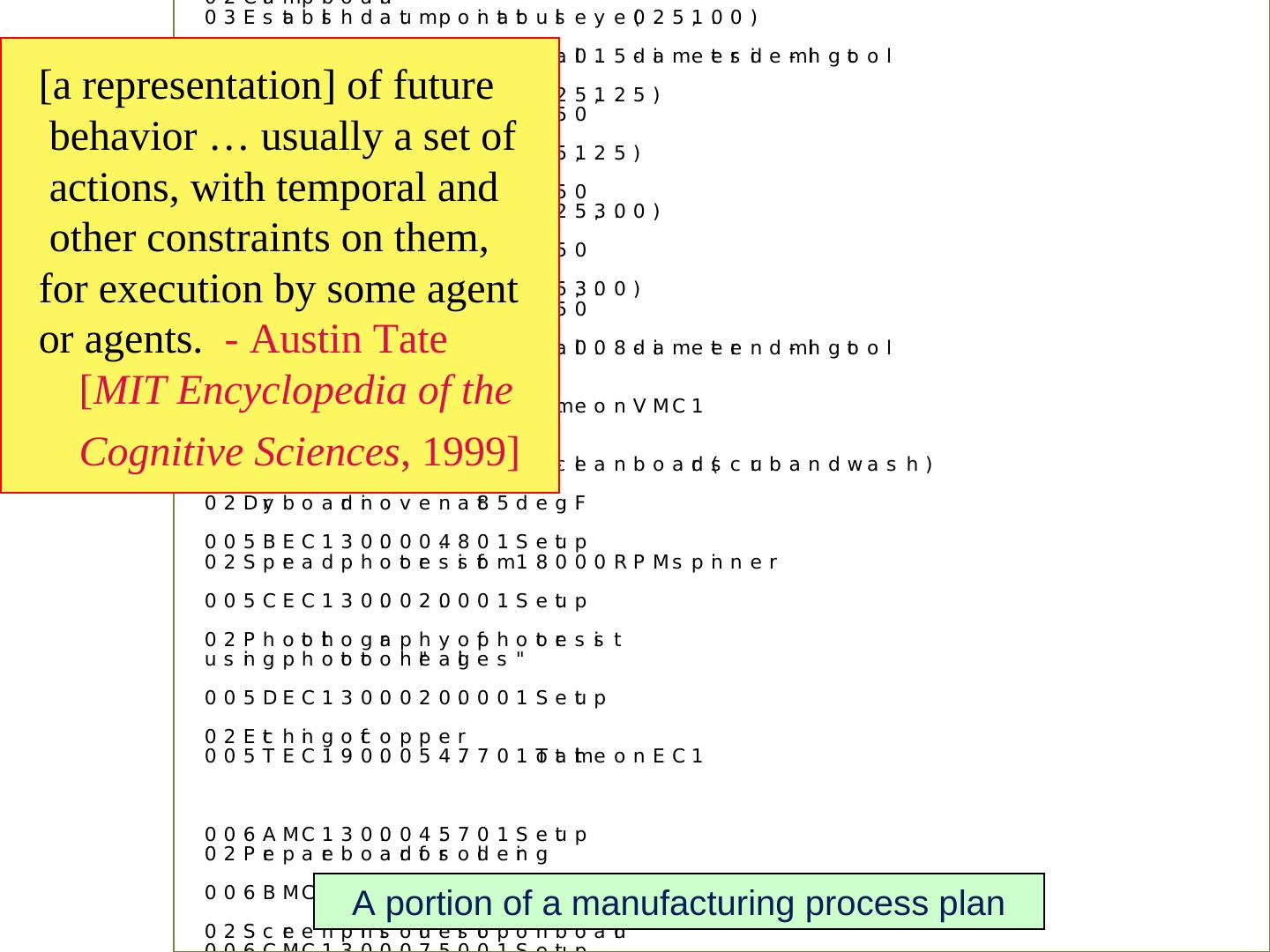9 . 02Ca l mp b o a rd 03Es a t b lis h d a tu m p o in ta tb u ls e y e (0 .2 5 ,1 .0 0 ) 0 0 4 B V M C 1 0 .1 0 0 .3 4 0 1 In s ta l0 .1 5 -d ia me te rs id e -miln g to o l [a representation] 0 2 R o u g h sof id e future -milp o c k e ta t(-0 .2 5 ,1 .2 5 ) le n g th 0 .4 0 ,w id th 0 .3 0 ,d e p th 0 .5 0 behavior 0… usually a set of 3 F in is h s id e -m ilp o c k e ta t(-0 .2 5 ,1 .2 5 ) actions, with le n g th temporal 0 .4 0 ,w id th 0 .3 and0 ,d e p th 0 .5 0 0 4 R o u g h s id e -milp o c k e ta t(-0 .2 5 ,3 .0 0 ) other constraints le n g th 0 .4 0 ,w on id th them, 0 .3 0 ,d e p th 0 .5 0 for execution0 5 F inby is h ssome id e -m ilp oagent c k e ta t(-0 .2 5 ,3 .0 0 ) le n g th 0 .4 0 ,w id th 0 .3 0 ,d e p th 0 .5 0 or agents.0 0- 4Austin C V M C 1 0Tate .1 0 1 .5 4 0 1 In s ta l0 .0 8 -d ia me te re n d -miln g to o l [MIT Encyclopedia 0 0 4 T V M C 1 2 .5 0 of [.] 4 .8 7the 0 1T o ta ltim e o n V M C 1 Cognitive 0 0 5Sciences, A E C 1 0 .0 0 3 21999] .2 9 0 1 P re -c le a n b o a rd (s c ru b a n d w a s h ) 0 2 D ry b o a rd in o v e n a t8 5 d e g .F 005BEC13 00 . 0 0 .4 8 0 1 S e tu p 0 2 S p re a d p h o o t re s is fro t m1 8 0 0 0 R P M s p in n e r 0 0 5 C E C 1 3 0 .0 0 2 .0 0 0 1 S e tu p 02Ph oo t lith o g ra p h y o fp h o to re s is t us n i g p h o to o t o in l "re a l.ig e s " 0 0 5 D E C 1 3 0 .0 0 2 0 .0 0 0 1 S e tu p 02Ec t hni g o fc o p p e r 0 0 5 T E C 1 9 0 .0 0 5 4 .7 7 0 1 T o ta ltime o n E C 1 0 0 6 A M C 1 3 0 .0 0 4 5 . 7 0 1 S e tu p 0 2 P re p a re b o a rd o f rs o ld e rin g 0 0 6 B M C 1 3 0 .0 0 0 .2 9 0 1 S e tu p A portion of a manufacturing process plan Dana Nau: Lecture slides for Automated Planning 0 2 Commons Licensed under the Creative S c re e nAttribution-NonCommercial-ShareAlike p rin ts o ld e rs to p o n b o a rd License: http://creativecommons.org/licenses/by-nc-sa/2.0/