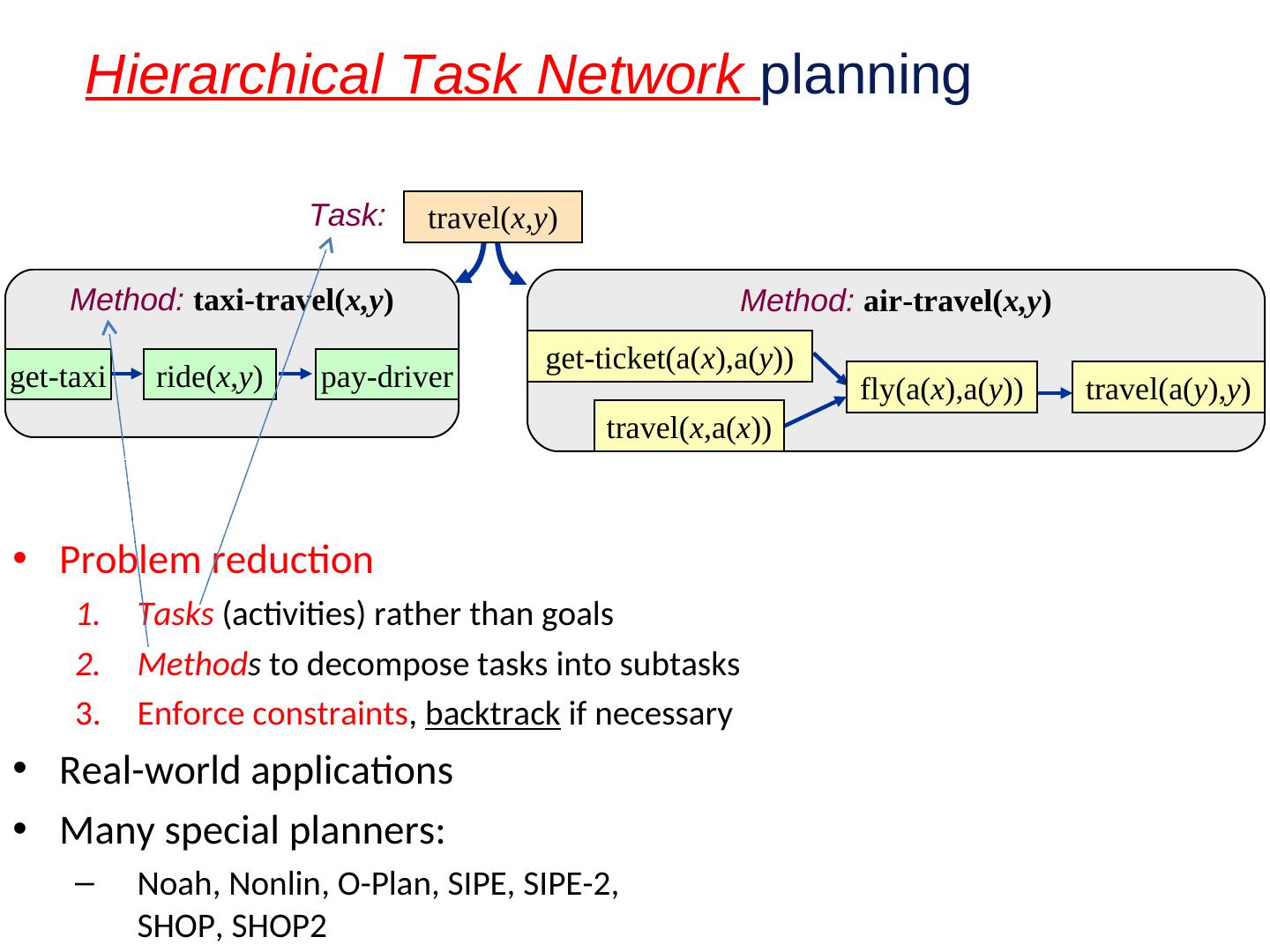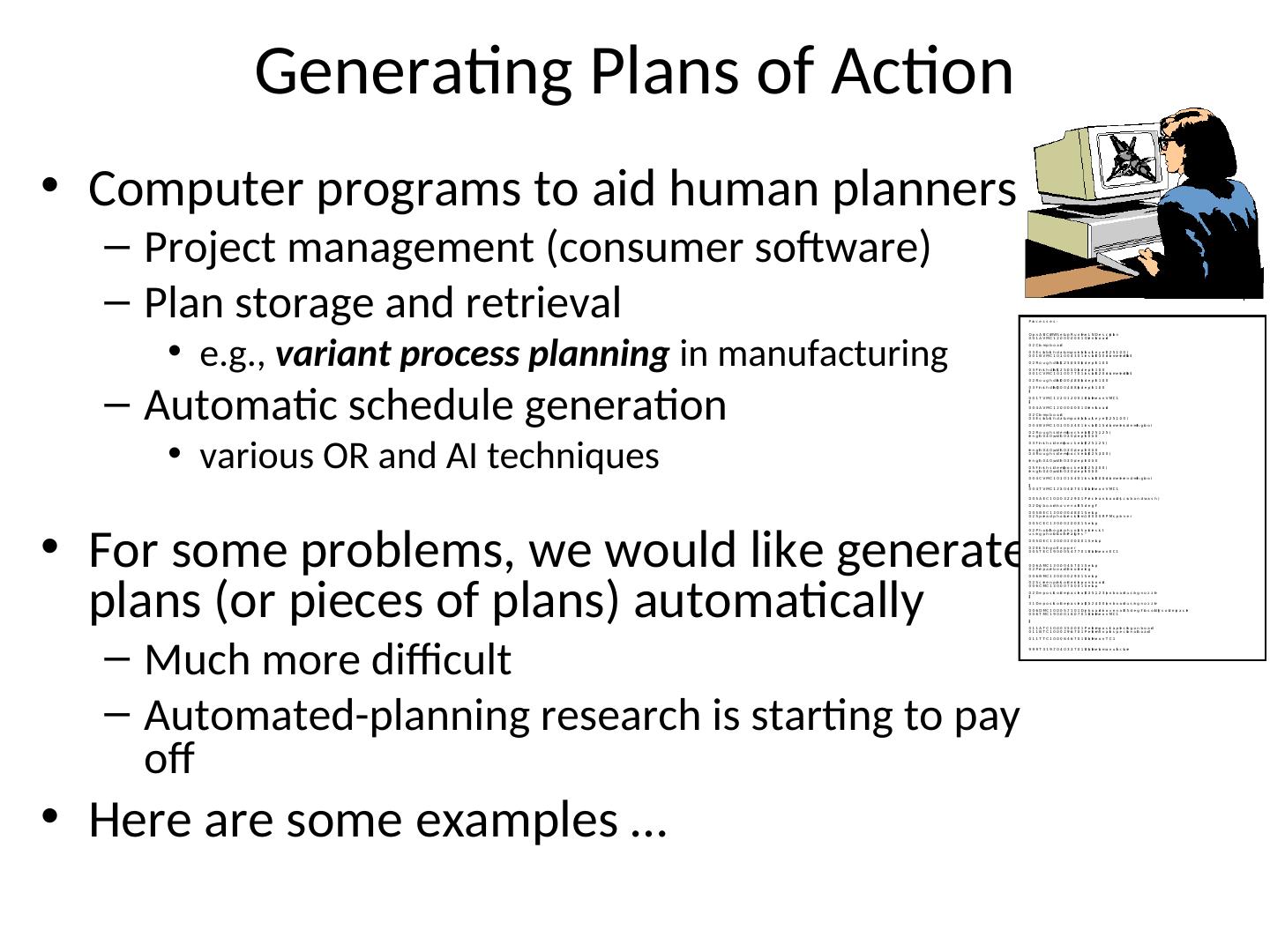 10 . Generating Plans of Action • Computer programs to aid human planners – Project management (consumer software) – Plan storage and retrieval P ro c e s s e s : • e.g., variant process planning in manufacturing O p n A B C /WWS e tu p R u n im t e L N D e s c rip tio n 0 0 1 A V M C 1 2 .0 0 0 0 . 0 0 1 O rie n b t o ad r 0 2 C la mp b o a rd 0 3 E s ta b lis h d a tu mp o in ta tb u ls e y e (0 .2 5 ,1 .0 0 ) 0 0 1 B V M C 1 0 .1 0 0 .4 3 0 1 In s ta l0 .3 0 -d ia me te rd rilb it 0 2 R o u g h d rila t(1 .2 5 ,-0 .5 0 )to d e p th 1 .0 0 03Fn i is h d ila r t(1 2 . 5 -0 , .5 0 )to d e p th 1 .0 0 0 0 1 C V M C 1 0 .1 0 0 7 . 701n I s at l0 2 . 0d- ia me te rd rilb it – Automatic schedule generation 0 2 R o u g h d rila t(0 .0 0 ,4 .8 8 )to d e p th 1 .0 0 0 3 F in is h d rila t(0 .0 0 ,4 .8 8 )to d e p th 1 .0 0 [.] 0 0 1 T V M C 1 2 .2 0 1 .2 0 0 1 T o ta ltime o n V M C 1 [.] 0 0 4 A V M C 1 2 .0 0 0 .0 0 0 1 O rie n tb o a rd 0 2 C la mp b o a rd 0 3 E s ta b lis h d a tu mp o in ta tb u ls e y e (0 .2 5 ,1 .0 0 ) 0 0 4 B V M C 1 0 .1 0 0 .3 4 0 1 In s ta l0 .1 5 -d ia me te rs id e -miln g to o l 0 2 R o u g h s id e -milp o c k e a t t(-0 2 . 5 ,1 .2 5 ) • various OR and AI techniques le n g th 0 4 . 0w , id th 0 .3 0 d , e p th 0 .5 0 0 3 F in is h s id e -m ilp o c k e ta t(-0 .2 5 ,1 .2 5 ) le n g th 0 .4 0 ,w id th 0 .3 0 ,d e p th 0 .5 0 0 4 R o u g h s id e -milp o c k e ta t(-0 .2 5 ,3 .0 0 ) le n g th 0 .4 0 ,w id th 0 .3 0 ,d e p th 0 .5 0 05Fn i is h s d i em - ilp o c k e at t(-0 2 . 5 ,3 .0 0 ) le n g th 0 .4 0 ,w d i th 0 .3 0 ,d e p h t 05. 0 0 0 4 C V M C 1 0 .1 0 1 .5 4 0 1 In s ta l0 .0 8 -d ia me te re n d -miln g to o l [.] 0 0 4 T V M C 1 2 .5 0 4 .8 7 0 1 T o ta ltime o n V M C 1 0 0 5 A E C 1 0 .0 0 3 2 .2 9 0 1 P re -c le a n b o a rd (s c ru b a n d w a s h ) 0 2 D ry b o a rd in o v e n a t8 5 d e g .F 005BEC1300 . 0 0 .4 8 0 1 S e tu p 02Sp e r adpho o t re s is fro t m1 8 0 0 0 R P M s p in n e r • For some problems, we would like generate 0 0 5 C E C 1 3 0 .0 0 2 .0 0 0 1 S e tu p 0 2 P h o to lith o g ra p h y o fp h o to re s is t u s in g p h o to to o lin "re a l.ig e s " 0 0 5 D E C 1 3 0 .0 0 2 0 .0 0 0 1 S e tu p 02Ec t hni g o fc o p p e r 0 0 5 T E C 1 9 0 .0 0 5 4 .7 7 0 1 T o ta ltime o n E C 1 0 0 6 A MC 1 3 0 .0 0 4 .5 7 0 1 S e tu p 0 2 P re p a re b o a rd fo rs o ld e rin g 0 0 6 B MC 1 3 0 .0 0 0 .2 9 0 1 S e tu p plans (or pieces of plans) automatically 0 2 S c re e n p in r ts o ld e rs o t p o n b o a rd 0 0 6 C MC 1 3 0 0 . 0 7 .5 0 0 1 S e tu p 0 2 D e p o s its o ld e rp a s te a t(3 .3 5 ,1 .2 3 )o n b o a rd u s in g n o z z le [.] 3 1 D e p o s its o ld e rp a s te a t(3 .5 2 ,4 .0 0 )o n b o a rd u s in g n o z z le 0 0 6 D MC 1 0 0 . 0 5 .7 1 0 1 D ry b o a rd ni o v e n a t8 5 d e g .F to s o lid ify s o ld e rp a s te 0 0 6 T MC 1 9 0 0 . 0180 . 701T oat ltime o n M C 1 [.] 0 1 1 A T C 1 0 .0 0 3 5 .0 0 0 1 P e rfo rmp o s t-c a p te s tin g o n b o a rd 0 1 1 B T C 1 0 .0 0 2 9 .6 7 0 1 P e rfo rmfi n a lin s p e c tio n o fb o a rd – Much more difficult 0 1 1 T T C 1 0 .0 0 6 4 .6 7 0 1 T o ta ltime o n T C 1 9 9 9 T 3 1 9 .7 0 4 0 3 .3 7 0 1 T o ta ltime to ma n u fa c tu re – Automated-planning research is starting to pay off • Here are some examples …