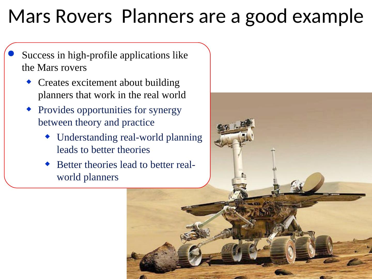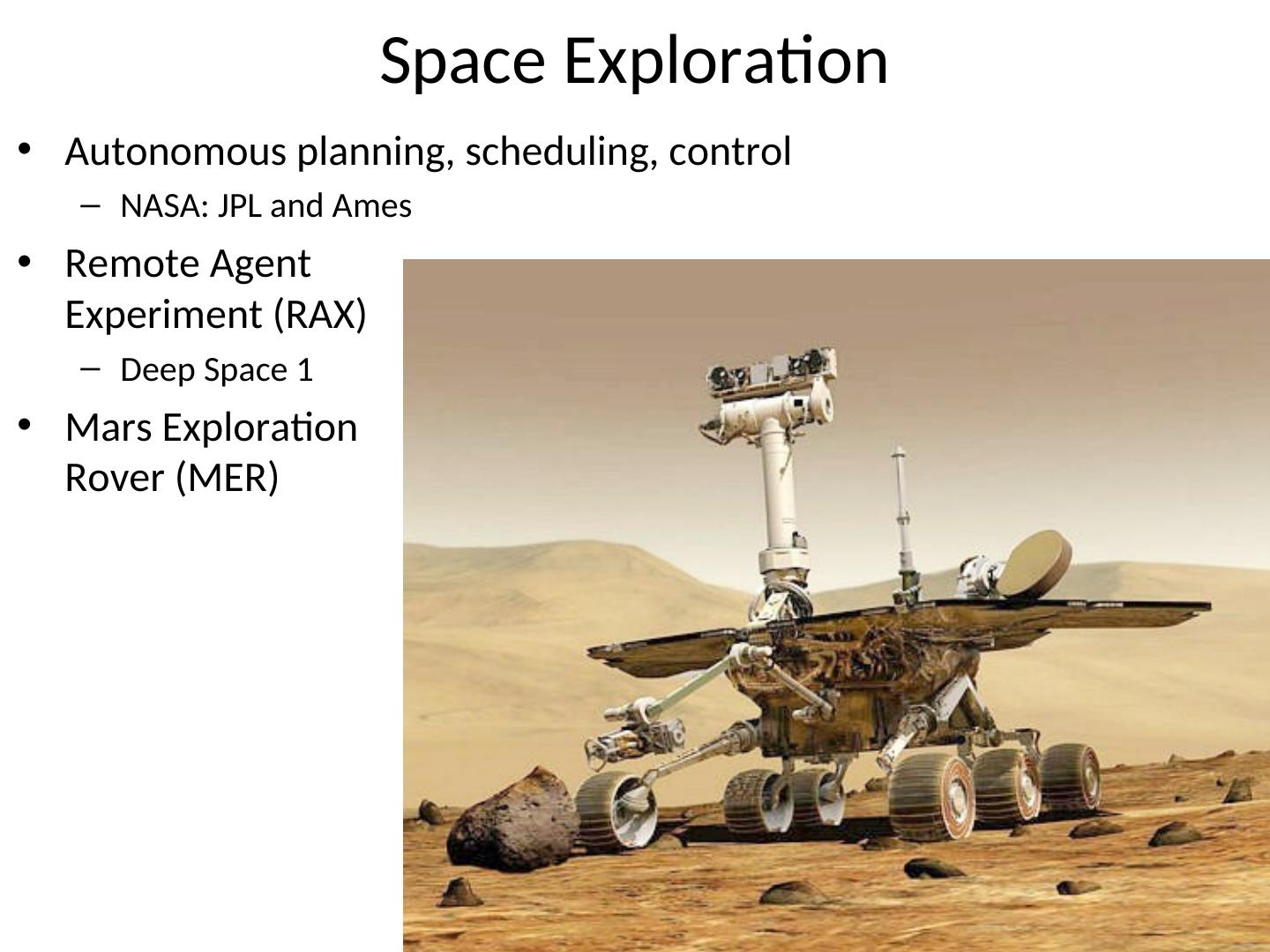 11 . Space Exploration • Autonomous planning, scheduling, control – NASA: JPL and Ames • Remote Agent Experiment (RAX) – Deep Space 1 • Mars Exploration Rover (MER) Dana Nau: Lecture slides for Automated Planning Licensed under the Creative Commons Attribution-NonCommercial-ShareAlike License: http://creativecommons.org/licenses/by-nc-sa/2.0/