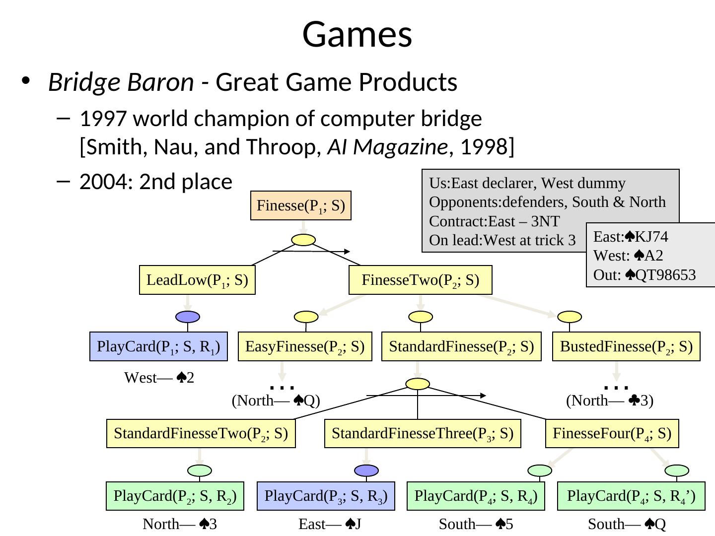 13 . Games • Bridge Baron - Great Game Products – 1997 world champion of computer bridge [Smith, Nau, and Throop, AI Magazine, 1998] – 2004: 2nd place Us:East declarer, West dummy Finesse(P1; S) Opponents:defenders, South & North Contract:East – 3NT On lead:West at trick 3 East:KJ74 West: A2 LeadLow(P1; S) FinesseTwo(P ; S) Out: QT98653 2 PlayCard(P1; S, R1) EasyFinesse(P2; S) StandardFinesse(P2; S) BustedFinesse(P2; S) West— 2 … (North— Q) … (North— 3) StandardFinesseTwo(P2; S) StandardFinesseThree(P3; S) FinesseFour(P4; S) PlayCard(P2; S, R2) PlayCard(P3; S, R3) PlayCard(P4; S, R4) PlayCard(P4; S, R4’) Dana Nau: Lecture slides for Automated Planning North— 3 East— J South— 5 South— Q Licensed under the Creative Commons Attribution-NonCommercial-ShareAlike License: http://creativecommons.org/licenses/by-nc-sa/2.0/