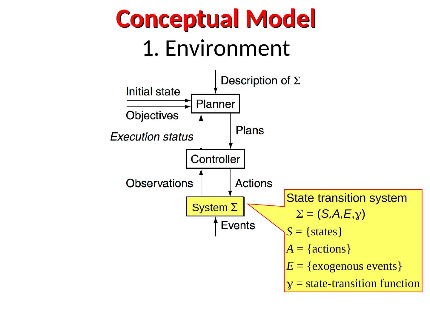 16 .Conceptual Model 1. Environment State transition system System = (S,A,E,) S = {states} A = {actions} E = {exogenous events} = state-transition function