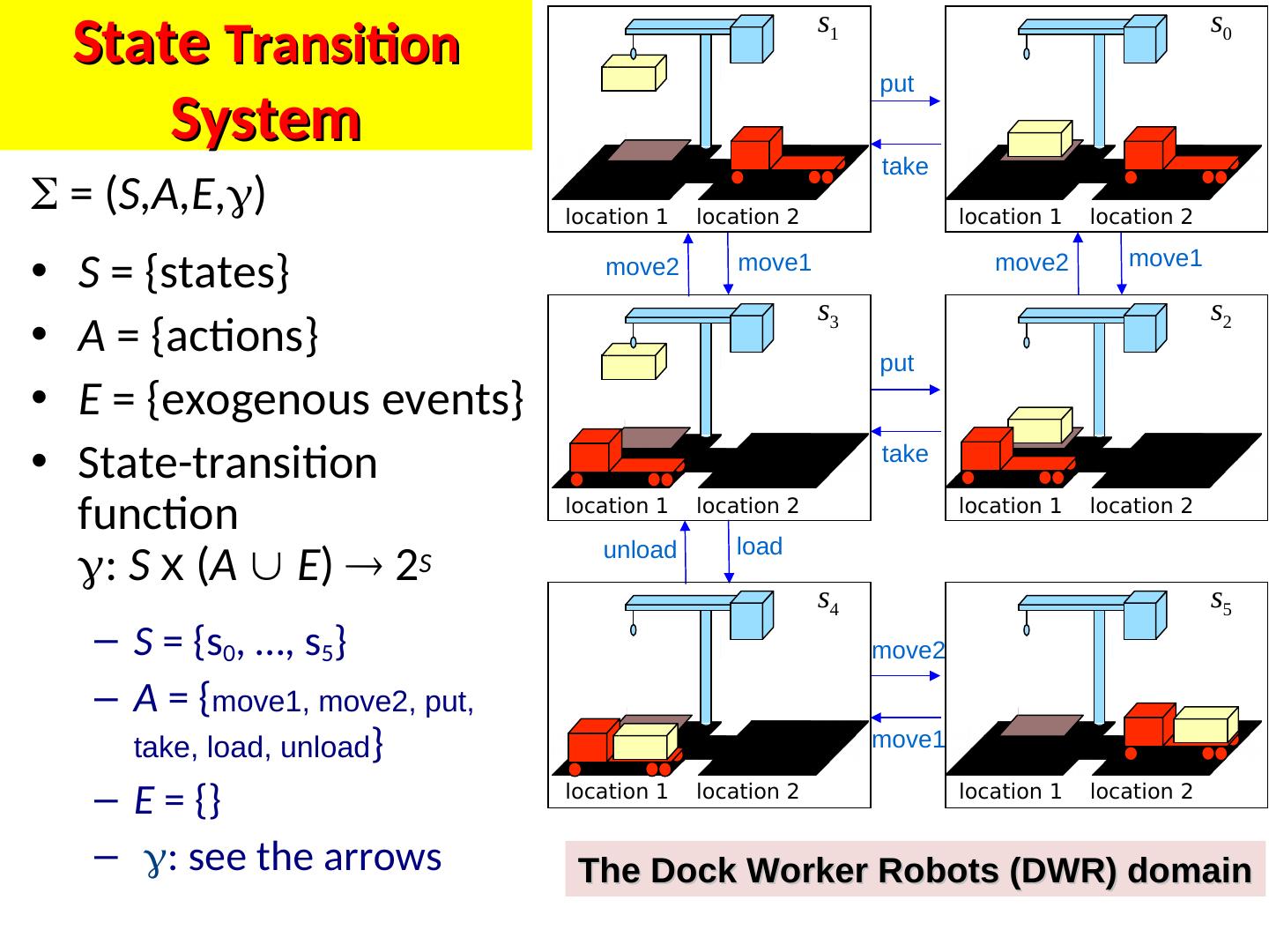 17 . s1 s0 State Transition put System take = (S,A,E,) location 1 location 2 location 1 location 2 • S = {states} move2 move1 move2 move1 s3 s2 • A = {actions} put • E = {exogenous events} • State-transition take function location 1 location 2 location 1 location 2 unload load : S x (A E) 2S s4 s5 – S = {s0, …, s5} move2 – A = {move1, move2, put, take, load, unload} move1 – E = {} location 1 location 2 location 1 location 2 – : see the arrows The Dock Worker Robots (DWR) domain
