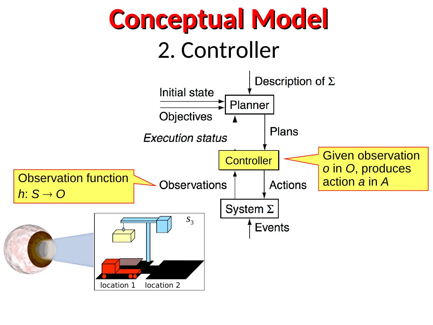 18 . Conceptual Model 2. Controller Controller Given observation o in O, produces Observation function action a in A h: S O s3 location 1 location 2