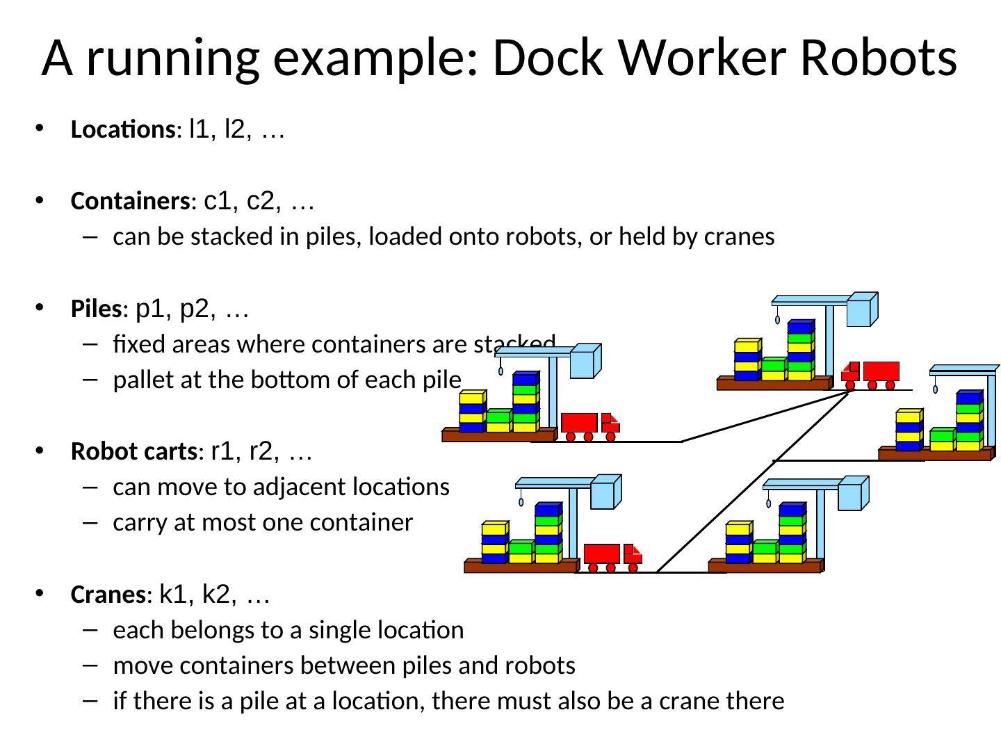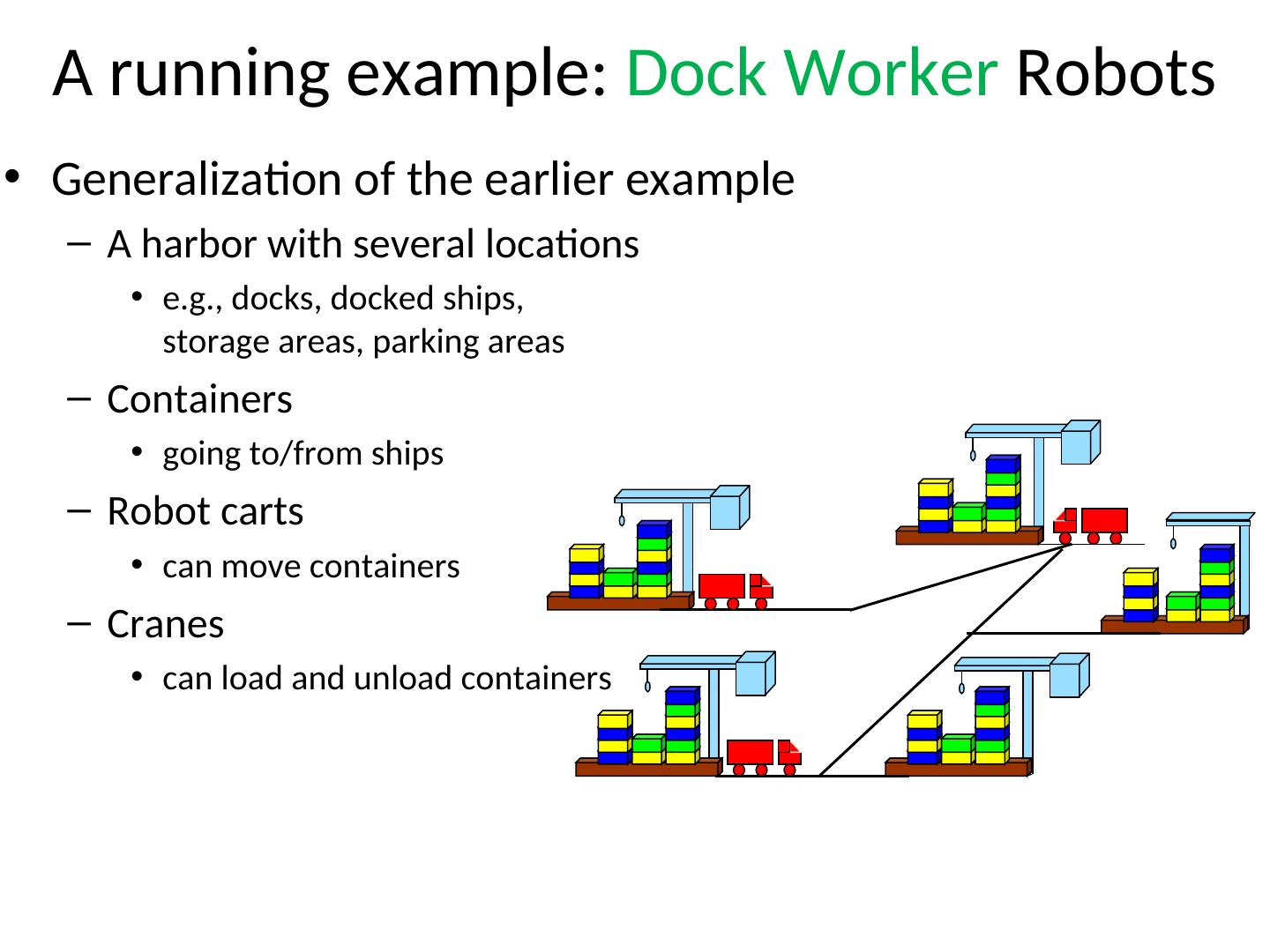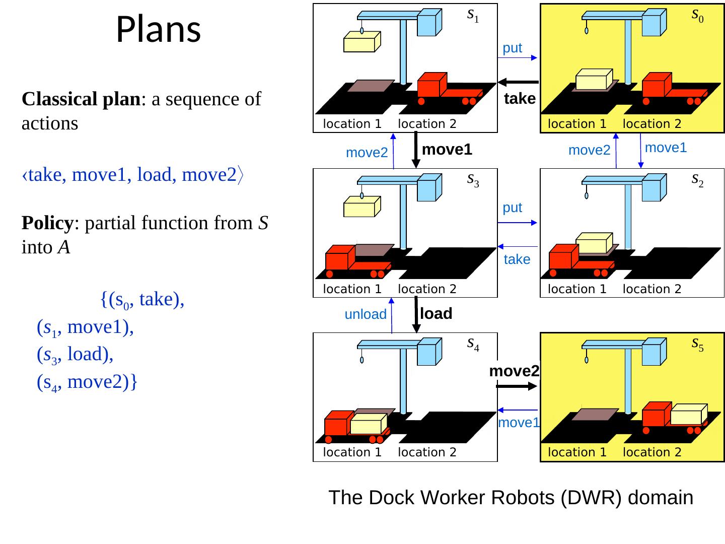 22 . s1 s0 Plans put Classical plan: a sequence of take take actions location 1 location 2 location 1 location 2 move2 move1 move1 move2 move1 take, move1, load, move2 s3 s2 put Policy: partial function from S into A take location 1 location 2 location 1 location 2 {(s0, take), unload load load (s1, move1), s4 s5 (s3, load), move2 move2 (s4, move2)} move1 location 1 location 2 location 1 location 2 The Dock Worker Robots (DWR) domain